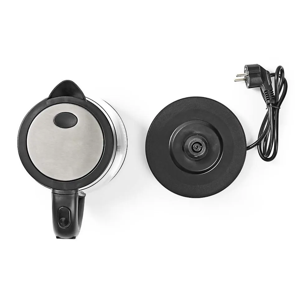Description du produitNotre bouilloire électrique Nedis puissante et élégante offre un fonctionnement tout aussi satisfaisant que son apparence : elle a une bonne capacité de 1,7 litre. Grâce à la puissance de 2 200 W, vous pourrez préparer votre thé en un rien de temps.La LED bleue indique que la bouilloire est en cours d’utilisation et avec un boîtier en verre, vous pouvez réellement voir quand l’eau bout.Le socle pivotant à 360° sans fil garantit un levage facile.L’élément chauffant dissimulé minimise l’accumulation de calcaire et, associé au filtre amovible, cette bouilloire est très facile à nettoyer, pour garantir à tout moment le goût délicieux de vos boissons chaudes.CaractéristiquesCouvercle de sécurité : se verrouille en place et s’ouvre par pression d’une mainSocle pivotant à 360° : permet de retirer et de replacer facilement la bouilloireSans fil : pour un remplissage et un versement facilesIndicateur de niveau d’eau des deux côtés : pratique pour les gauchers et les droitiersFiltre amovible : facile à rincercapacité de 1,7 litreBoîtier en verre avec des touches en acier inoxydable : élégant et résistantArrêt automatique et protection contre l’ébullition à sec : pour votre sécuritéLED bleue : indique quand la bouilloire est en cours d’utilisationContenu de l’emballageBouilloire électriqueGuide de démarrage rapideSpécificationsAffichage de la température: NumériqueConsommation électrique maximale: 2200 WContrôleur Strix: OuiCouleur: TransparentÉclairage LED: OuiÉlément chauffant dissimulé: OuiEspace de rangement du cordon: OuiFiche d’alimentation: Type F (CEE 7/7)Filtre en calcai