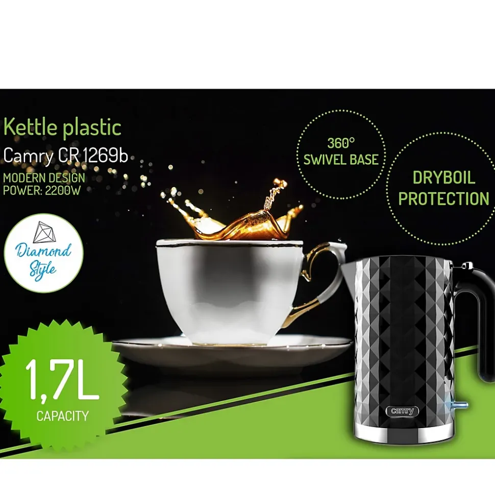 Bouilloire électrique Camry CR 1269B de max 2200W alimente les nouvelles tendances de conception parmi les appareils électriques. Il s’agit d’une série très exclusive de bouilloires choisies généralement par des personnes qui apprécient une apparence attrayante. La bouilloire est bien plus qu’un simple appareil domestique – elle fonctionne également comme une décoration unique de votre cuisine. Un élément parfait des intérieurs modernes ainsi que des salles représentatives telles qu’un bureau, le bureau du registraire ou une salle de conférence. La capacité de 1,7l vous permet de faire bouillir de l’eau pour plusieurs personnes en même temps.Base pivotante 360Puissance: 2200WCapacité maximale: 1,7 LÉlément chauffant plat en acier inoxydableDesign moderneOuverture de l’interrupteur du couvercleProtection contre l’ébullition à secFiltre anticalc…
