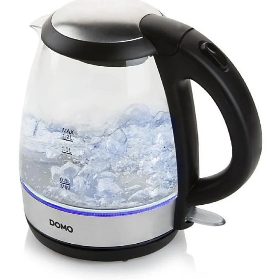 Bouilloire en verre DOMO 1,2 L 2200 W avec socle 360°, éclairage bleu, arrêt automatique et protection anti chauffe à sec ; carafe en verre et couvercle inox.