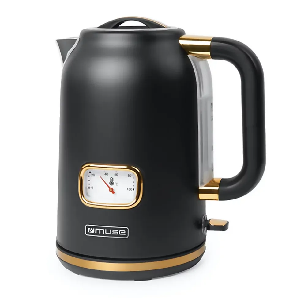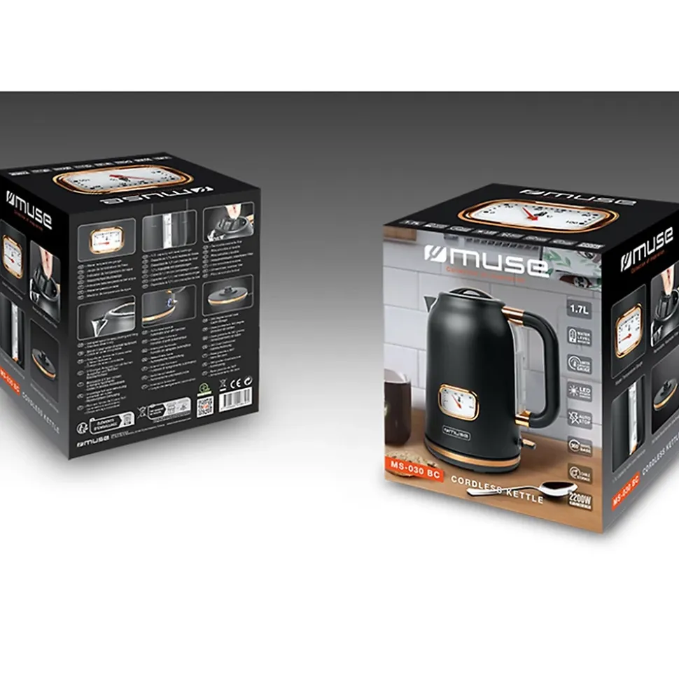 Bouilloire sans fil MUSE MS-030 BC avec indicateur de température de l’eau – 2200W – Filtre amovible et lavable – Capacité de 1.7 L. Cette bouilloire fonctionnelle et design d’une puissance de 2200 W fera bouillir un 1,7L d’eau en un tour de main !CARACTÉRISTIQUES :- Indicateur de température de l’eau- Filtre amovible et lavable- Bec en V pour verser et remplir facilement- Capacité de 1.7 L avec indicateur de niveau- Corps en acier inoxydable 304- Interrupteur lumineux- Enrouleur de cordon- Arrêt automatique- Base pivotante à 360 degrésPUISSANCE :- 2200WALIMENTATION :- 220-240V, 50/60HzPRODUIT :- 252 mm (H) x 154 mm (P) x 219 mm (L)- Poids net: 1.08 kgEMBALLAGE :- 250 mm (H) x 200 mm (P) x 220 mm (L)- Poids brut: 1.36 kg…