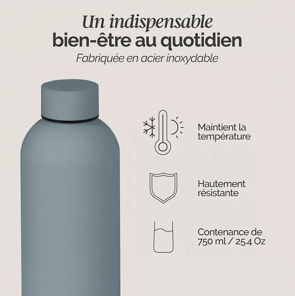 La gourde isotherme de la marque Vivezen est un indispensable bien-être qui vous accompagne dans votre quotidien, pour des pique-niques, au travail ou encore lors de vos activités sportives.Cette gourde est fabriquée en acier inoxydable de qualité et est hautement résistante. Elle se glisse, par exemple, dans votre sac pour plus de praticité et maintient la température de votre boisson, chaude ou froide, durant des heures.Cet équipement réutilisable, au design élégant et polyvalent, vous permet de réduire vos consommations de plastique.La gourde isotherme de 750 ml mesure environ 7.5 cm de diamètre et 26.5 cm de hauteur (23 cm sans le bouchon). Nous vous proposons un large choix de coloris et dimensions. Elle est très facile à laver.Notre société a pour ambition de répondre à vos besoins du quotidien en vous proposant des gammes de plus en plus variées, durables et tendances. Un large éventail de produits est à retrouver à travers nos différentes marques.