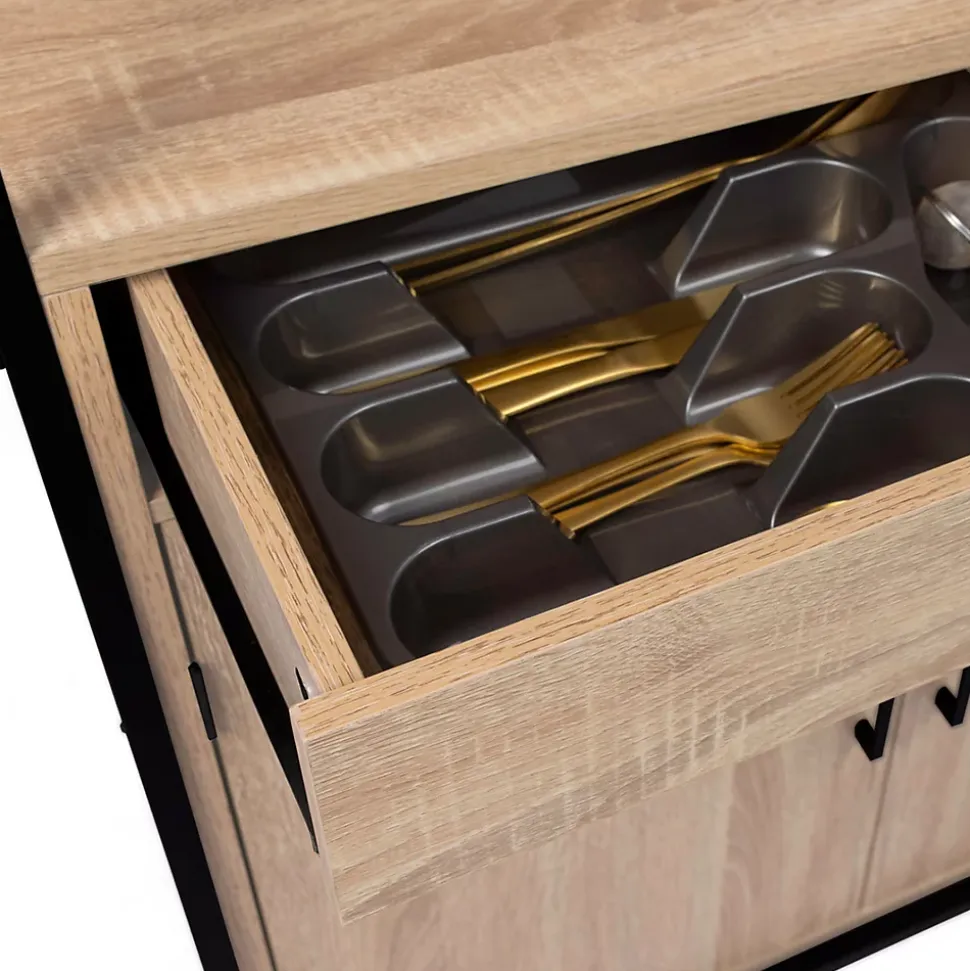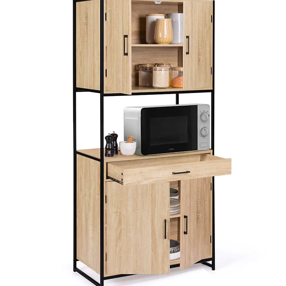 Vous êtes à la recherche d’un meuble pratique, fonctionnel et esthétique pour mettre dans votre cuisine ? Découvrez le meuble de cuisine DETROIT de 80 cm. Grâce à ses 2 placards ainsi qu’à son tiroir, vous bénéficiez d’une grande capacité de rangement. Utilisez le placard de 2 portes du bas, idéal pour stocker vos assiettes, poêles, casseroles et autres ustensiles de cuisine. Son étagère centrale supporte maximum 15 Kg et est ajustable sur 3 hauteurs différentes. Pour davantage de rangements, ce meuble est composé d’un tiroir où vous pouvez organiser vos couverts ainsi que de vos louches, fouets, couteaux de cuisine. Le centre du meuble de cuisine est constitué d’une large niche recouvrant le plan de travail, situé à 83 cm du sol. Vous pourrez y poser votre micro-ondes ou ranger vos accessoires de décoration, comme des livres de recettes.La partie haute du buffet est équipée d’un second placard composé de 2 portes, utile pour accueillir vos aliments ou vos verres les plus fragiles. À vous de choisir l’agencement de votre meuble de cuisine ! Grâce à son look industriel, en panneaux de particules mélaminés et métal noir, vous pourrez l’intégrer dans tous styles de décoration, dans votre cuisine ou votre cellier. Profitez en pour apporter une note tendance à votre intérieur ! Conçu en PB, il est d’une robustesse appréciable.N’hésitez plus et profitez dès maintenant du meuble de cuisine pratique et esthétique !Dimensions du buffet de cuisine 80 CM DETROIT Dimensions globales : Longueur 80 cm x largeur 40 cm x Hauteur 176.5 cmDimensions du placard double bas : L.73,5 x l.37,5 x H.54 cm Dimensions du placard double haut : L.73,5 x l.37,5 x H.53 cm Dimensions intérieures du tiroir : L.69 x l.35 x H.7,5 cm Hauteur du sol de l’espace de stockage central : 83 cmEspace central : L.80 x l.40 x H.35,5 cm2 étagères réglables 3 positionsPoids supporté par étagère : environ 15 kg Hauteur des pieds : 13 cmMatériaux : panneaux de particules mélaminés 15 mm – portes en PB 12 mmStructu
