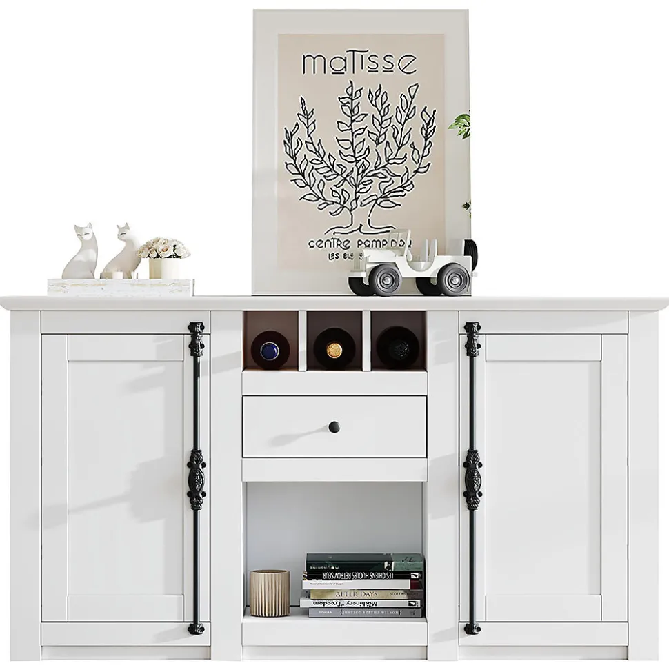 Caractéristiques du produitDimensions du colisSous-article 1 : 144,78 * 43,82 * 12,07 cm 19,26 kgSous-article 2 : 82,55 * 51,56 * 15,24 cm 18,44 kgInformations sur le produitDimensions 130 x 35 x 70 cmCouleur BlancMatériau Panneau de particules + MDFLED NONPosition de la lumière NONNombre de tiroirs 1Nombre d’armoires 2Poids brut/poids net 37,7 kg/33,56 kgIntégration fonctionnelle Rangement et présentation intégrés : du rangement pratique à la belle présentation en passant par une décoration polyvalente pour une meilleure qualité de vie.Avantages 2 portes + 1 tiroir + 1 espace de rangement semi-ouvert + 3 armoires à vin + longues poignées métalliques noiresCapacité de charge 40 kg
