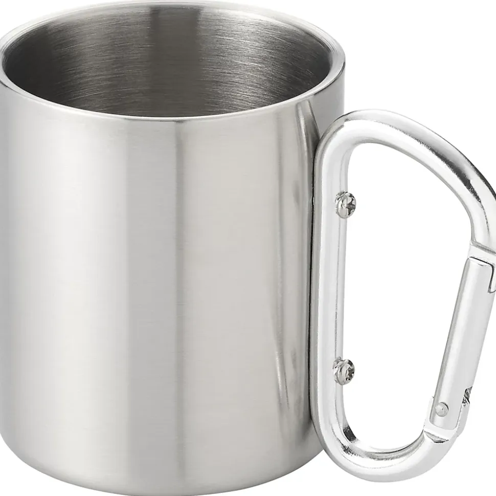Mug mousqueton isolé Alpes. Te à large manche de 200 ml en acier inoxydable avec mousqueton. Déal pour le camping ou les activités de plein air. Extérieur et intérieur en acier inoxydable. Conformité: contrôle des teneurs en cadmium.