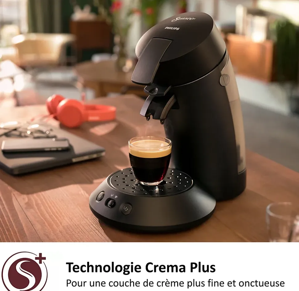 La plus iconique des machines à café SENSEO, revue au goût du jour. Sélectionnez un café long ou intense d’une manière simple et intuitive grâce au Sélecteur d’intensité sur la cafetière à dosette de Philips. La technologie Booster d’arômes répartit l’eau sur la dosette de café grâce à ses 45 trous afin d’obtenir un goût intense, et la technologie Crema plus offre une crème onctueuse. Les caractéristiques de cette machine : – Cette machine à café dosette offre une technologie Booster d’arômes qui tire le meilleur des dosettes en répartissant l’eau chaude de manière uniforme sur toute la dosette café Senseo grâce aux 45 buses d’arôme. – La technologie Crema plus produit une couche de crème particulièrement fine et onctueuse – De délicieuses recettes longues ou intenses d’une simple pression sur un bouton avec le Selecteur d’intensité. – Un grand choix de saveurs et de mélanges de café Senseo, afin de satisfaire tous les goûts – Préparez une ou deux délicieuses tasses de café Senseo en moins d’une minute. – La fonction Démarrage instantané prépare votre café dès que la machine a fini de chauffer. Une fois le café préparé, votre machine à café Senseo s’éteint automatiquement pour économiser de l’énergie. – Machine testée plus de 10 000 fois afin de garantir une qualité constante. De plus, elle offre une consommation d’énergie réduite et plus de matériaux recyclés (28 %* de plastiques recyclés, réduction de 45 %** de la consommation d’énergie)