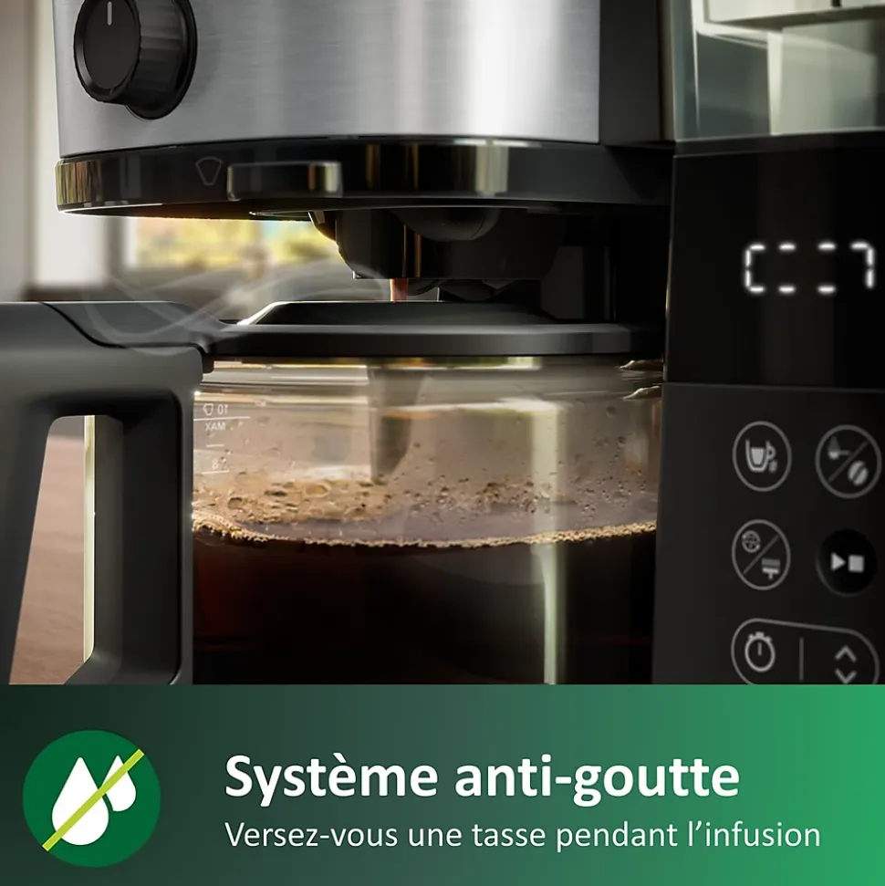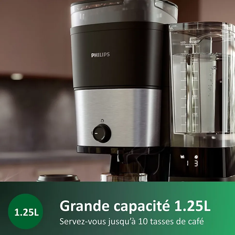 La cafetière Philips HD7888/01 allie innovation et praticité avec un broyeur intégré pour des arômes préservés, un réservoir 1,25 L pour 10 tasses, écran LED intuitif, réglages personnalisables, maintien au chaud jusqu’à 5h, et sécurité renforcée. Compacte et design, idéale pour toutes les cuisines.