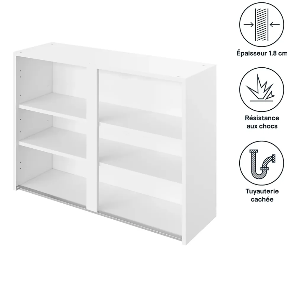 - Ce caisson haut dispose d’un vide sanitaire de 1,9 cm afin que toutes tuyauterie puissent être cachées derrière le panneau de fond.