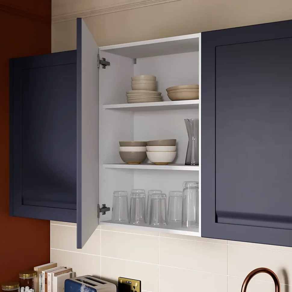 Nous avons conçu nos meubles de cuisine dans une perspective de durabilité. Ils sont voués à subir beaucoup d’usure et doivent donc être résistants. Des panneaux de 1,8cm d’épaisseur et une protection ABS sur les bords avant protègent ce grand meuble haut contre les chocs et garantissent sa robustesse. Ce meuble peut également être utilisé dans les angles. Il est livré avec 2 étagères, des supports de fixation murale, des fixations d’assemblage et une notice. Nous proposons une large gamme de charnières disponibles séparément. Vous pouvez choisir des solutions à ouverture Push to open ou à fermeture amortie. Un détail qui fait toute la différence