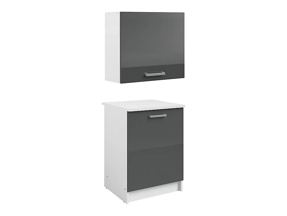 - Caissons de cuisine TRATTORIA – 1 meuble bas & 1 meuble haut – 2 portes – Coloris : Gris brillant et blanc – Style : Moderne – Haut : L60xP60xH84cm – Bas : L60xP33,3xH55,4cm – Tous aux fourneaux avec les caissons de cuisine TRATTORIA !