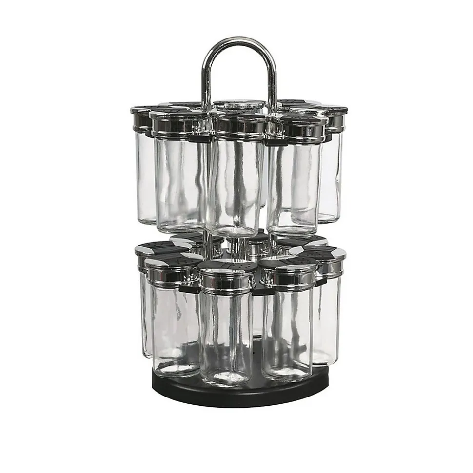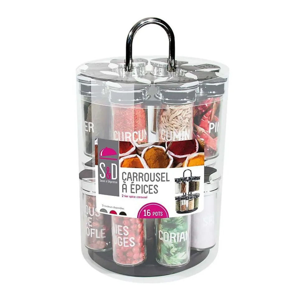 Ce carrousel à épices construit sur 2 étages présente 16 pots ronds en verre qui vous permettront de parfumer et de relever vos préparations culinaires en toute simplicité ! Remplissez-les et profitez de ce mécanisme tournant qui vous permettra de tout trouver rapidement.FICHE TECHNIQUE- Carrousel à épices en plastique.- Pots en verre.- Son mécanisme tournant vous permettra de trouver plus facilement l’épice de votre choix.- Contient 16 pots avec système de fermeture à double clapets, verseur et saupoudreur.CARACTERISTIQUES TECHNIQUES- Dimensions : Diam. 19 x H. 31,5 cm.- Poids : 1,84 kg.