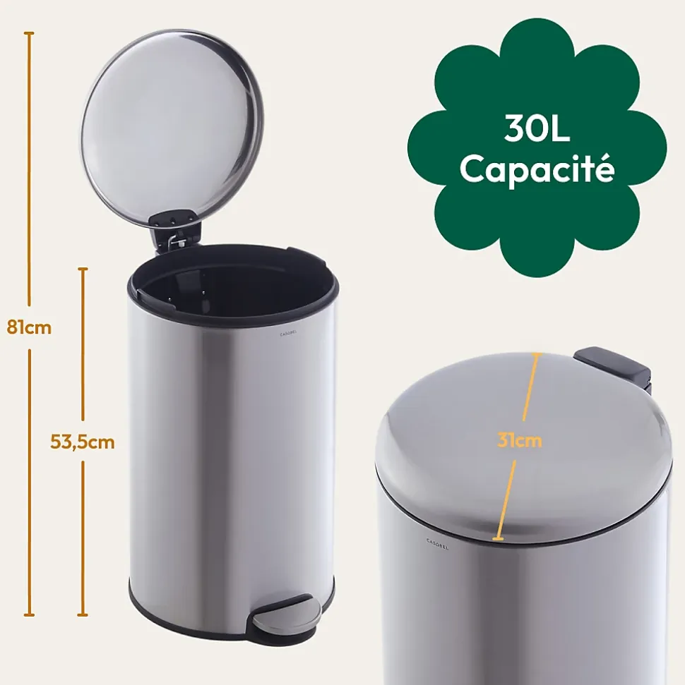 CASABEL Poubelle Cuisine 30L en Acier Inoxydable, Anti-Traces, Poubelle Ronde avec Pédale et Couvercle, Chrome