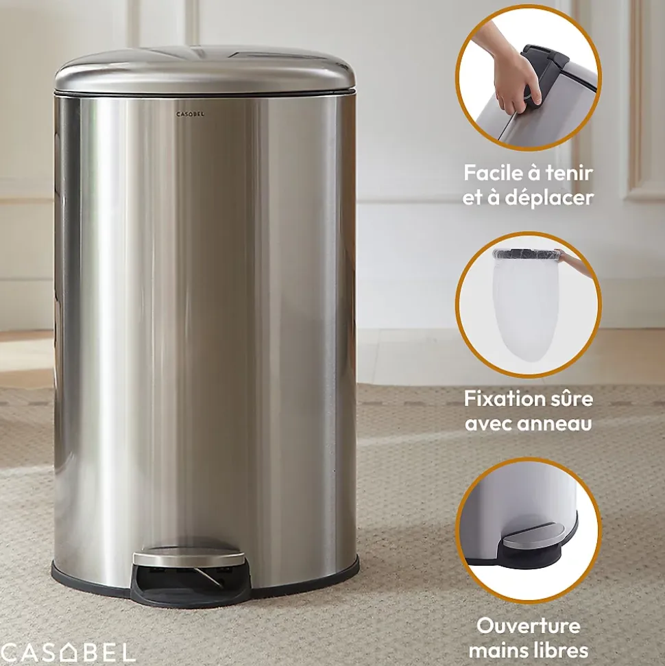 Cette poubelle de 50 L au design rond et compact offre une grande capacité, idéale pour les déchets quotidiens aussi bien en cuisine qu’au bureau. Conçue sans seau intérieur, elle dispose d’un anneau pratique pour maintenir le sac parfaitement en place, facilitant le nettoyage et l’utilisation au quotidien. Sa pédale robuste permet une ouverture hygiénique sans les mains, tandis que le couvercle à fermeture douce assure un usage silencieux et discret. Fabriquée en acier inoxydable brossé anti-traces, elle conserve une apparence propre et élégante même en cas d’utilisation intensive, y compris dans la salle de bain. Une poignée intégrée à l’arrière permet de la déplacer facilement et sans effort lors du ménage.