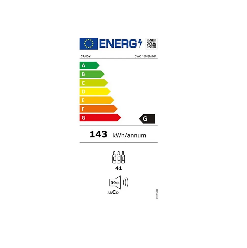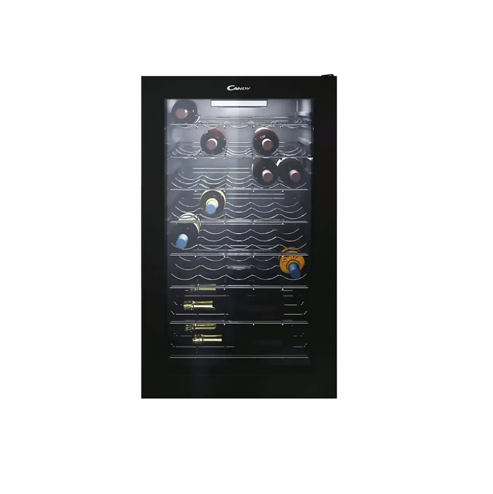 Cave à vin de service 41 bouteilles Candy – Cave à vin de service CWC150EM-NF de Candy.Eclairage LED.Un système d’éclairage latéral est également conçu pour une meilleure visibilité de vos bouteilles.Porte traitée anti-UV.Les rayons UV sont les ennemis de votre vin.Grâce à la porte en verre à filtres anti-UV, vos vins sont protégés contre les rayons indésirables. – Type : Cave à vin.Type de cave : Service.Construction : Pose libre.Classe d’efficacité énergétique : G.Classe d’efficacité sonore : C.Nombre de bouteilles stockées : 41.Niveau sonore : 39dB(A).Conso. d’électricité (kWh/an) : 143.Classe climatique : N-ST. Cet appareil est conçu pour être utilisé à une température ambiante comprise entre 16°C et 38°C.Type de froid : Statique.Eclairage intérieur : LED.Connecté : Non.Gestion de la température : Mono-température.Régulation de la T°C : Mécanique.Nbre zone(s) de températures : 1.Température réglable : Oui.T°C interne min. (°C) : 7.T°C interne max. (°C) : 18.Nombre de clayettes : 8.Matière clayettes : métal.Type de poignée : Intégrée.Porte traitée anti-UV : Oui.Nbre clayette(s) : 8.Nature clayette(s) : MétalType de clayettes : Semi-coulissante.Type de poignée : Intégrée.Display : Interne.Serrure : Non.Grille de protection : Non.Monozone : Oui.Affichage de la T°C : Oui.Type de thermomètre : Intérieur.Couleur : Noir.Hauteur (cm) : 84.5.Largeur (cm) : 49.Profondeur (cm) : 55.Poids (kg) : 29.