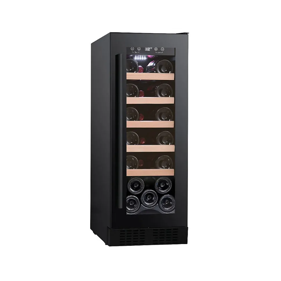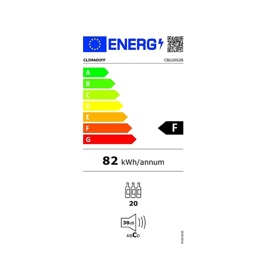 Cave à vin encastrable sous plan 20 bouteilles Climadiff – Cave à vin CBU20S2B de Climadiff de service mono compartiment avec 1 porte vitrée réversible, double vitrage gris en verre trempé traité anti-UV. – Type de produit : Cave à vin intégrée.Construction : Encastrable.Encastrable sous plan : Oui.Type de cave : Service.IEE : 103.7.Classe d’efficacité énergétique : F.Nombre de bouteilles stockées : 20.Conso. d’énergie annuelle (kWh/an) : 82.Volume total net (L) : 57.Emissions de bruit acoustique dans l’air (dB(A)) : 38.Classe d’émission de bruit acoustique dans l’air : C.Classe climatique : N-ST. Cet appareil est conçu pour être utilisé à une température ambiante comprise entre 16°C et 38°C.Réglage hiver : Non.Mode de dégivrage : Automatique.Type de source lumineuse : LED.Type de froid : Brassé.Connecté : Oui.Gestion de la température : Mono-température.Régulation de la T°C : Electronique.Nbre zone(s) de températures : 1.Température réglable : Oui.T°C interne min. (°C) : 5.T°C interne max. (°C) : 20.Divers : Compatible Vinotag (application gratuite de gestion de cave à vin).Système anti-vibrations : Oui.Type de porte : VitréePorte traitée anti-UV : OuiEclairage intérieur : LED.Nbre clayette(s) : 5.Nature clayette(s) : Bois.Porte réversible : Oui.Filtre à charbon actif : Oui.Autre(s) : Double vitrage gris en verre trempé, Clayettes coulissantes, 4 pieds réglables, Grille d’aération amovible.Affichage de la T°C : Oui.Type de thermomètre : Intérieur.Couleur : Noir.Hauteur (cm) : 86.5.Largeur (cm) : 29.5.Profondeur (cm) : 57.Poids (kg) : 29.