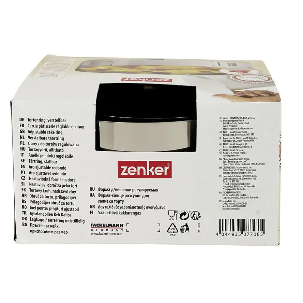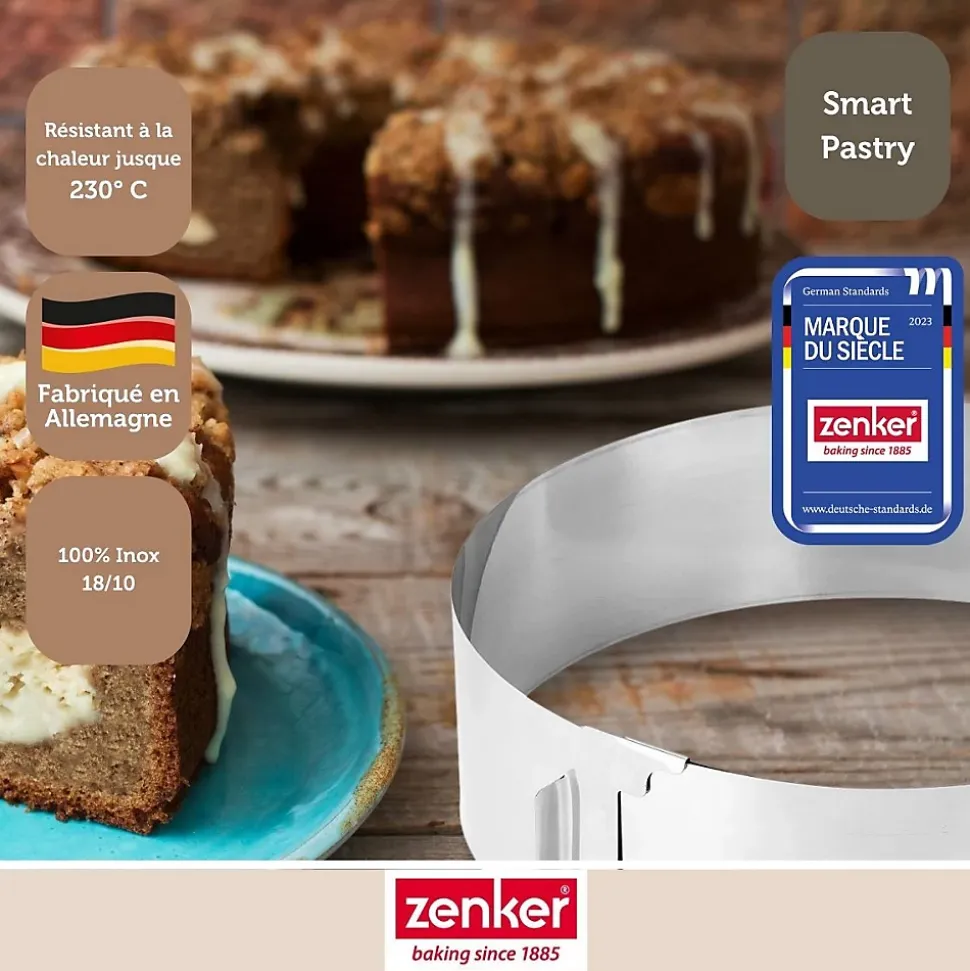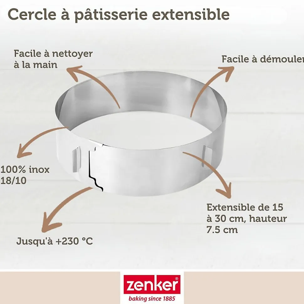 DESCRIPTION : Cercle de pâtisserie en inox réglable pour faire des gâteaux rondsLE PETIT + : Ce moule à gâteau réglable permet de faire un gâteau cuit ou nonCOMPOSITION : Acier inoxydableDIMENSIONS : 15-30 x 7,5 cmCONTENU : 1 cercle à pâtisserie extensibleCet ustensile de pâtisserie est un cercle de pâtisserie permettant de réaliser des gâteaux, des cheesecakes, de flans et bien d’autres. Vous pouvez utiliser ce cercle de pâtisserie pour cuire votre gâteau mais aussi pour monter un gâteau froid et le placer au réfrigérateur. Ce cercle de pâtisserie est extensible.Zenker est une marque faisant partie du groupe Fackelmann Brands et elle propose une large gamme d’ustensiles de pâtisserie et de moules à gâteaux. Concernant les ustensiles de pâtisserie, Zenker frappe fort en mettant à disposition des ustensiles de préparation mais aussi de décoration pour les pâtissiers confirmés. Côté moules à gâteaux c’est une marque pionnière qui propose des innovations telles que les moules à gâteaux en silicone et fibre de verre ne nécessitant pas de matière grasse et proposant des résultats de cuisson incroyables.Zenker possède donc une large gamme d’accessoires et d’ustensiles pour vous accompagner dans vos recettes du quotidien mais aussi pour des évènements exceptionnels comme les fêtes, les anniversaires, les mariages, etc.