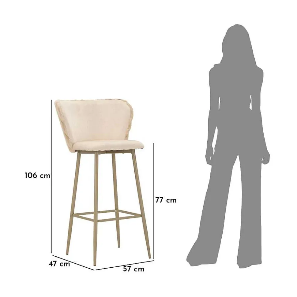 Aspect : Matériau principal = Contreplaqué • Matériaux secondaires = Eponge Métal Polyester • Autres dimensions : Hauteur d’assise = 77 • Hauteur repose pieds = 27 • Dimensions : Hauteur (en cm) = 106 • Longueur (en cm) = 58 • Profondeur (en cm) = 55 • Autres caractéristiques : A monter = Oui • Composition = Lot de 2 chaises de bar • Poids (en kg) = 5 • Chaise de bar en tissu et métal Alaska (Lot de 2)