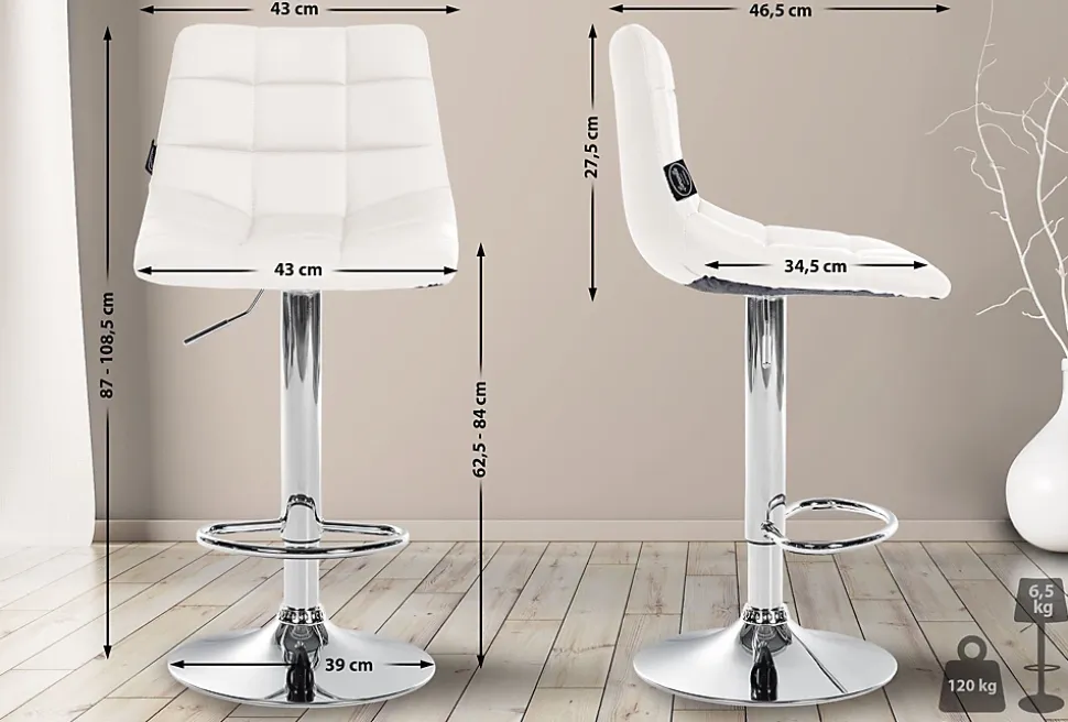 Tabouret de bar Jerry en similicuirÉlégant et stylé, le tabouret de bar Jerry en similicuir se distingue par son pied trompette réglable et son repose-pied correspondant, qui garantissent une assise confortable. La hauteur du tabouret peut être facilement et rapidement ajustée à vos besoins, afin qu’il s’adapte parfaitement à votre table ou à votre comptoir. Le tabouret de bar peut également pivoter à 360°, ce qui vous permet de vous déplacer librement.Le revêtement du tabouret est en similicuir souple et est doté d’un motif piqué classique. L’aspect élégant et intemporel du tabouret de bar est souligné par le revêtement en similicuir disponible en différentes couleurs. La solide structure métallique du tabouret est disponible en chrome ou en noir et assure une grande stabilité et une longue durée de vie. Le design minimaliste et moderne du tabouret s’intègre parfaitement dans tout intérieur.Composition du matériau: 100% PolyuréthaneCa. Dimensions:Hauteur totale : 87 – 108,5 cmLargeur totale : 43 cmProfondeur totale : 46,5 cmHauteur d’assise : 62,5 – 84 cmSurface d’assise (l x p) : 43 x 34,5 cmHauteur du dossier : 27,5 cmMax. Capacité de charge : 120 kgPoids : 6,5 kgAssise:Revêtement avec coutures décorativesPosition d’assise agréable grâce au dossierAssise confortablement rembourréePiétement:Matériau : métal noir ou chroméPied trompette stableSolideParticularités :Un look moderne allié à un grand confortUne assise confortable même après plusieurs heuresUn revêtement facile d’entretienConseils d’entretien :Essuyer les salissures légères avec un chiffon en coton humideNe passer l’aspirateur sur les surfaces qu’avec un accessoire appropriéNe pas utiliser de produits de nettoyage domestiques