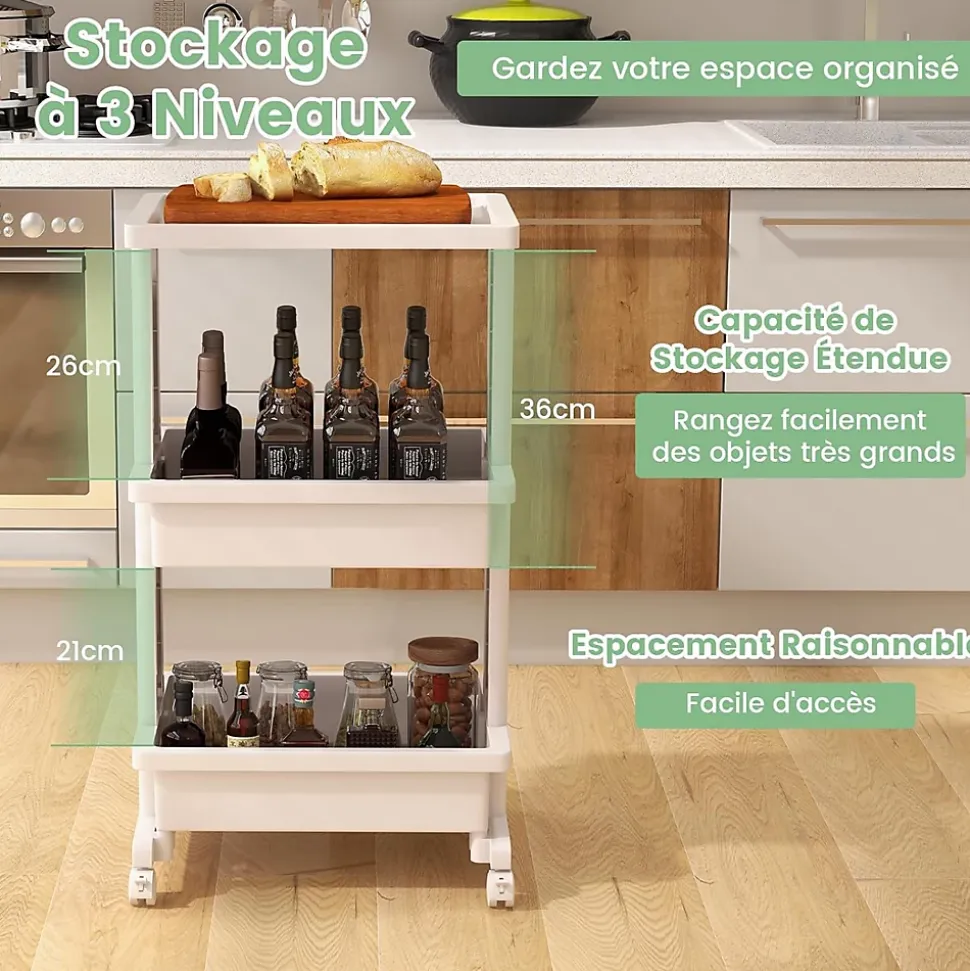 - Entretien et Dimensions Faciles : Ce chariot roulant à 3 niveaux présente une surface lisse et imperméable, ce qui vous permet de le nettoyer facilement avec un chiffon humide. Les dimensions hors tout sont de 45 x 30 x 81 cm (L x l x H).
