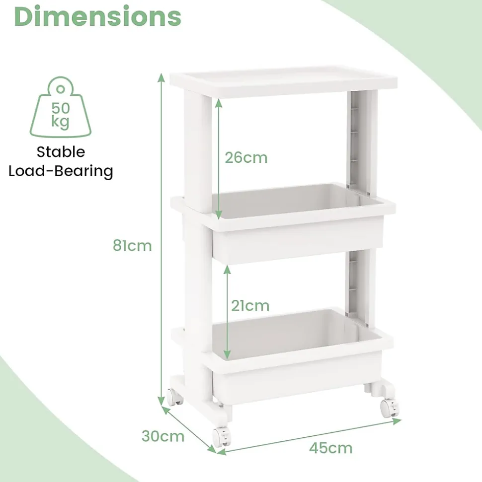 Matériau : PPDimensions hors tout : 45 x 30 x 81 cm (L x l x H)Capacité de poids totale : 50 kgCapacité de poids du plateau : 10 kgCapacité de poids de chaque compartiment : 20 kgPoids net : 2 kg