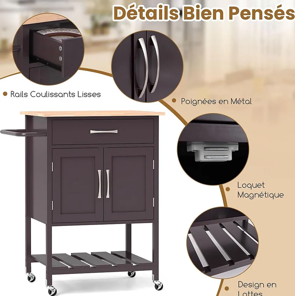 - Rangement Spacieux et Accessible : Gardez vos essentiels de cuisine bien organisés et à portée de main ! Le chariot de cuisine comprend un tiroir pour les ustensiles, une armoire de grande taille pour les outils ou les fournitures de cuisine et une étagère inférieure pour contenir des plats supplémentaires ou des contenants de rangement.