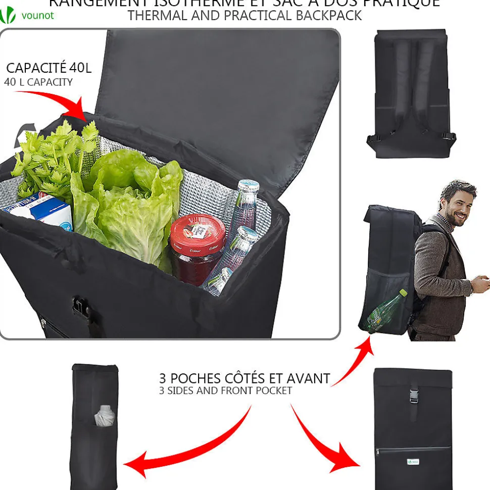LES + PRODUITS Système de 6 roues monte escalier et trottoir Utilisations multiples Sac isotherme de 40L Facile à installer et rangerPOURQUOI CHOISIR NOTRE PRODUIT ? Le chariot de course à un système de 6 roues qui vous permet de monter ou de descendre les escaliers sans difficulté. Le chariot de course 3 en 1 se transforme également en diable et en sac à dos isotherme. Le chariot de marché est fait de métal résistant qui peut charger jusqu’à 30kg sans problème. Le système de 6 roues lui permet de s’adapter aux obstacles facilement. Le caddie comprend un sac de 40L isotherme vous permettant de mettre plus de 30kg de produits frais. De plus, il possède 3 pochettes de rangement et se transforme en sac à dos !Bande pour la fermeture – Sac de rangement isotherme de 40L – Petit compartiment avec fermeture à glissièreCARACTÉRISTIQUES- Dimensions du sac: env. 33x20x55 cm- Dimensions du cadre: env. 40x45x104 cm- Dimensions des roues: Ø12 cm- Poids: env. 3.0 kg- Couleur: Noir- Matériel: 100% Polyester 600D- Capacité du sac: env. 40L- Charge Max: 30KgIMPORTANT :Les livraisons se font en France métropolitaine à l’exception des îles qui ne sont pas reliées au continent par un pont (Corse, Ile d’Yeux etc.) et des DOM-TOM.
