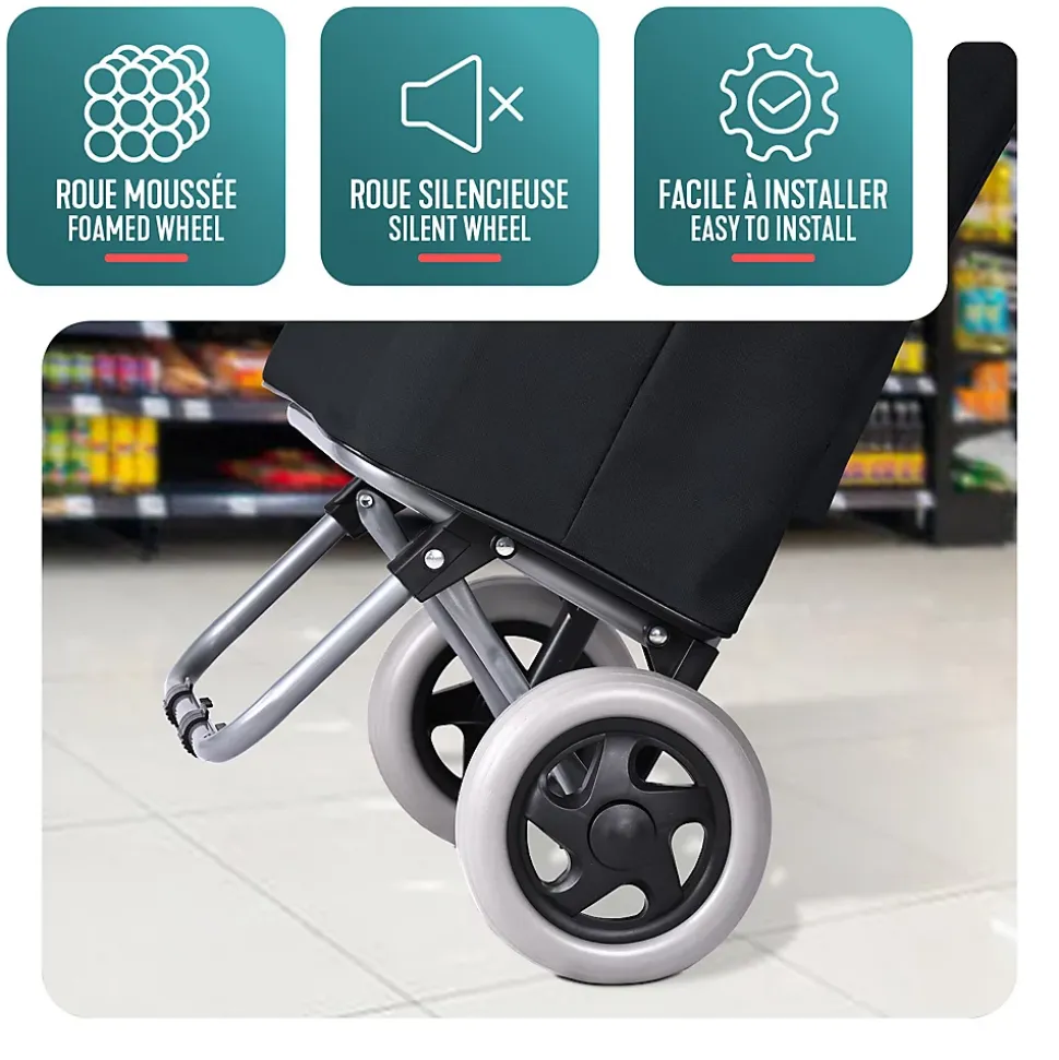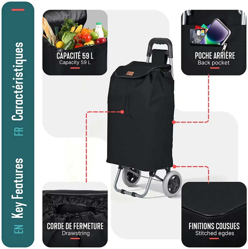 LES + PRODUITS Grande capacité Cadre en métal robuste Roues silencieuses et fluides Utilisation 2 en 1 DESCRIPTION Ce chariot de courses dispose d’un grand volume de 59 L, pratique pour les courses, les sorties au marché ou le transport d’objets du quotidien. La poche arrière zippée offre un rangement sûr et accessible pour téléphone, portefeuille, clés et petits essentiels. Sa structure en métal est à la fois légère et solide, pour une utilisation fiable au quotidien. Même bien chargé, le chariot reste stable et facile à manier. Le sac en tissu Oxford est résistant à la déchirure, conçu pour durer et se nettoie facilement après usage. Le système à 2 roues de ce caddie assure une conduite souple et stable sur les surfaces irrégulières comme les bosses, fissures ou trottoirs. Les roues résistantes limitent l’usure et roulent de manière discrète pour un confort d’utilisation au quotidien. Avec son sac, il fonctionne comme un chariot de courses classique. Sans le sac, le plateau rigide le transforme en diable, idéal pour empiler et déplacer facilement cartons, caisses, bouteilles d’eau et autres objets. Grâce à sa conception pliable et à son sac de rangement amovible, ce chariot se replie en quelques gestes. Une fois plié, il prend très peu de place et se range facilement dans un coin, un placard ou dans le coffre de la voiture, pratique quand on manque d’espace. CARACTÉRISTIQUE Matériau : Métal ; Oxford Dimensions : 38 x 28 x 93 cm Poids : 2kg Couleurs disponibles : Gris ; Noir ; Bleu marine