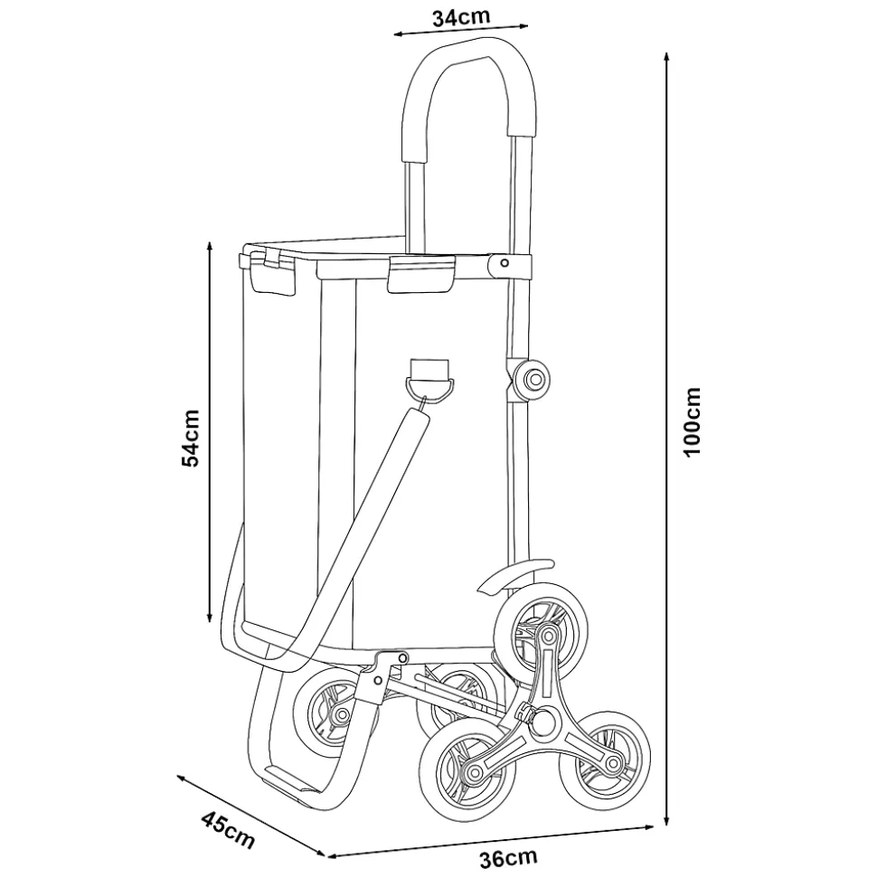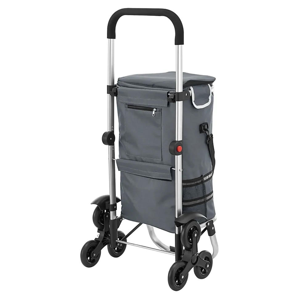 Chariot de coursesPratique et pliable, ce chariot simplifie vos achats au quotidien. Léger avec son châssis en aluminium et sa poignée antidérapante, il assure un transport confortable et sécurisé.Polyvalent, il se transforme en diable gâce à son sac amovible. étanche et équipé d’un filet latéral pour bouteilles, il protège vos courses de la pluie et offre un rangement supplémentaire.Sa conception pliable permet un rangement facile, tandis que les roues en étoile franchissent aisément escaliers et marches. Le sac isotherme intégré garde vos produits au frais, idéal pour les courses, pique-niques et sorties.Alliant fonctionnalité et design ergonomique, ce chariot est un indispensable pour votre ménage.Points forts :- moyen pratique de faire ses courses- sac à provisions amovible avec éléments décoratifs réfléchissants- pliable et peu encombrant- roues avec dispositif anti-éclaboussures – avec sac thermique isolé- peut être utilisé comme diable jusqu’à 20 kg- poignée antidérapante et extensible- capacité 41 litresMatière :- sac : 100% polyester (tissu Oxford 600D)- cadre : aluminium- roues : caoutchouc- poignée : mousseDimensions :- totales (ha x la x pro) : 100 x 45 x 36 cm- sac (ha x la x pro) : 54 x 33 x 23 cm- plié (ha x la x pro) : 48,5 x 45,5 x 16 cm- longueur de la poignée : 34 cm- diamètre des roues : 12 cm chacuneCouleur :gris foncéContenu de la livraison :1 x chariot1 x sacProduit de la marque :[en.casa]