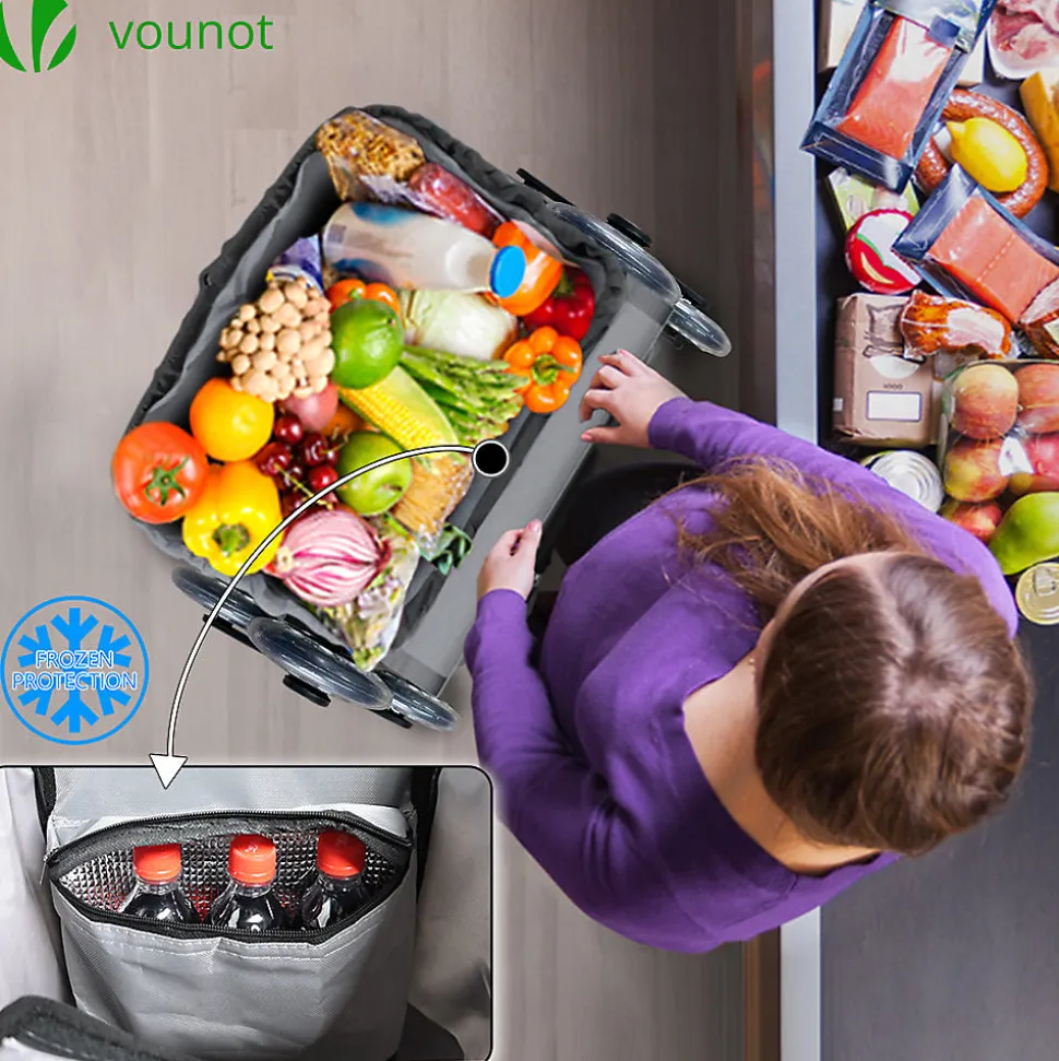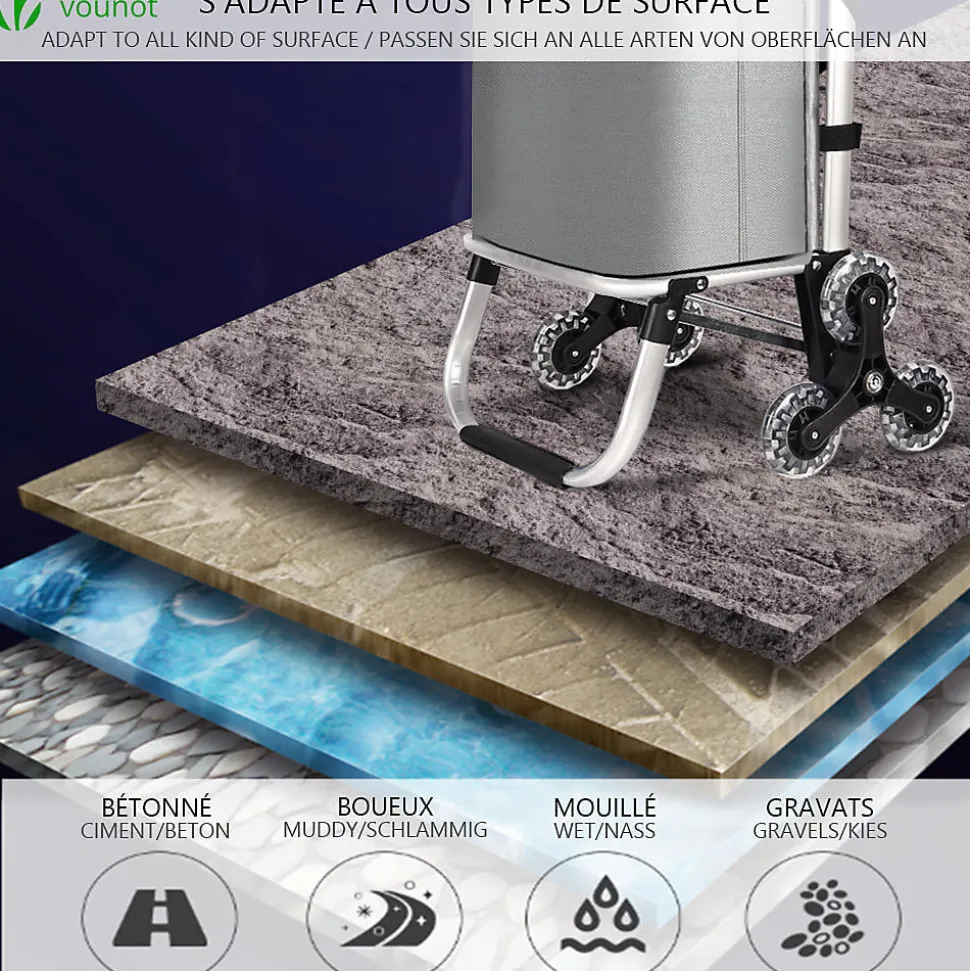 LES + PRODUITS Système de 6 roues monte escalier et trottoir Structure en aluminium robuste Sac imperméable et utilisations multiples Facile à installer et rangerDESCRIPTION Grâce à son système de 6 roues de qualité, vous pourrez aisément monter ou descendre les escaliers sans le moindre effort et profité d’un déplacement silencieux. Facile à ranger avec un cadre en aluminium qui se plie, le chariot prendra une place minimale pour un gain de place optimal. Grâce à son cadre en aluminium, le chariot peut s’utiliser comme un diable. Avec le sac imperméable et sa sangle intégrée, il peut être utilisé comme une sacoche de course. Avec la structure en aluminium robuste, le sac imperméable et le sac isotherme intégré, notre chariot vous permettra de charger jusqu’à 40kg sans problème. La poignée en mousse confortable vous permettra un déplacement du caddie agréable. Les poches de deux cotés et les bandes réflectives sur le sac vous donneront une meilleure expérience de courses.CARACTÉRISTIQUES Dimensions du sac : 33*23*55 cm environ Dimensions du cadre : 44.5*39*100 cm environ Poids : env. 3kg Matériel : Polyester, aluminium Charge Max : 40kg