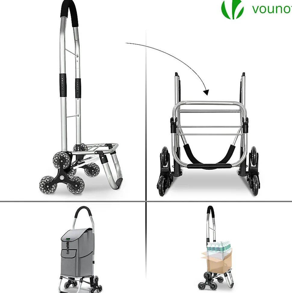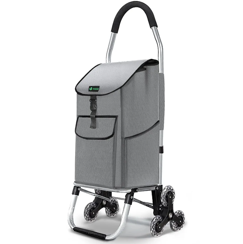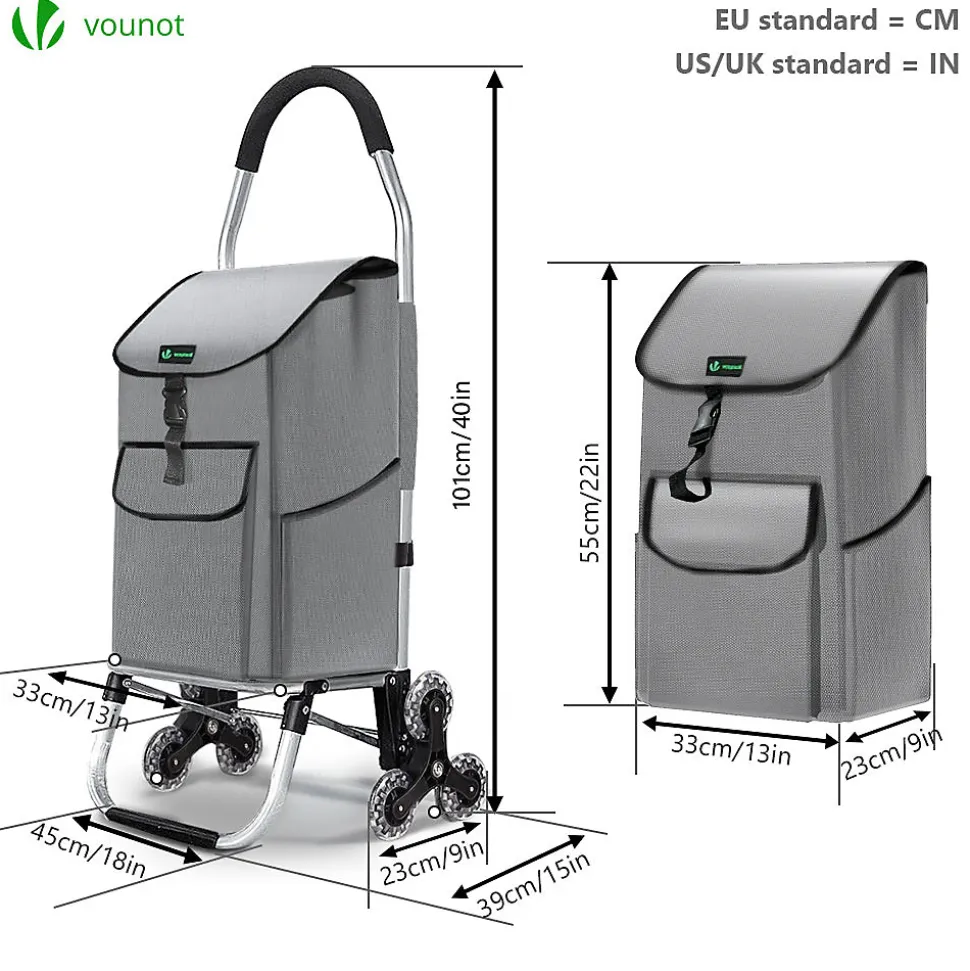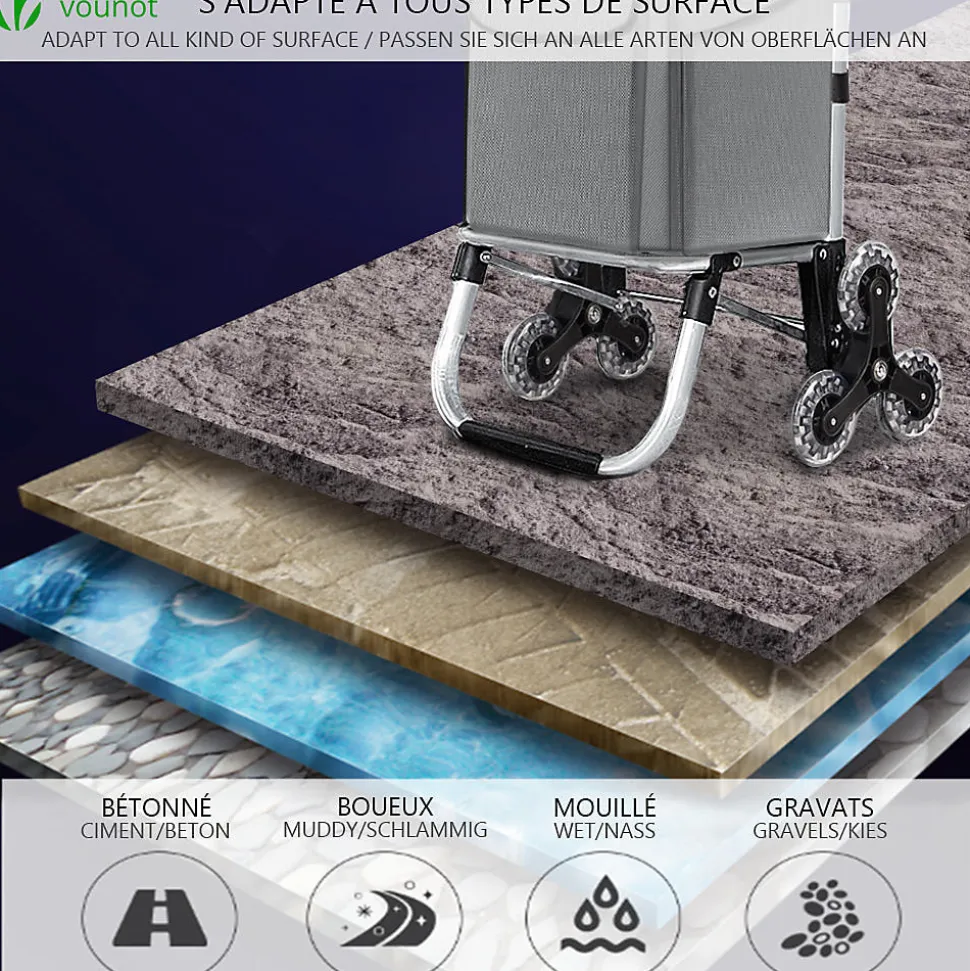 LES + PRODUITS Système de 6 roues monte escalier et trottoir Structure en aluminium léger Sac imperméable et utilisations multiples Facile à installer et rangerDESCRIPTION Grâce à son système de 6 roues de qualité, vous pourrez aisément monter ou descendre les escaliers sans le moindre effort et profiter d’un déplacement silencieux. Facile à ranger avec un cadre en aluminium qui se plie, le chariot prendra une place minimale pour un gain de place optimal. En plus d’être un chariot de course, il peut s’utiliser comme un diable pouvant supporter jusqu’à 40kg de cartons empilés, boîtes ou autres grâce à son cadre aluminium robuste. Avec la structure en aluminium robuste et le sac imperméable, le chariot de course léger qui fournit une durée de vie plus longue contre les intempéries. La poignée en mousse confortable vous permettra un déplacement du caddie agréable. Les poches de deux cotés vous permettront de rajouter un parapluie ou petite gourde.CARACTÉRISTIQUES Dimensions du sac : 33*23*55 cm environ Dimensions du cadre : 45*39*101 cm environ Poids : env. 3kg Matériel : Polyester, aluminium Charge Max : 40kg