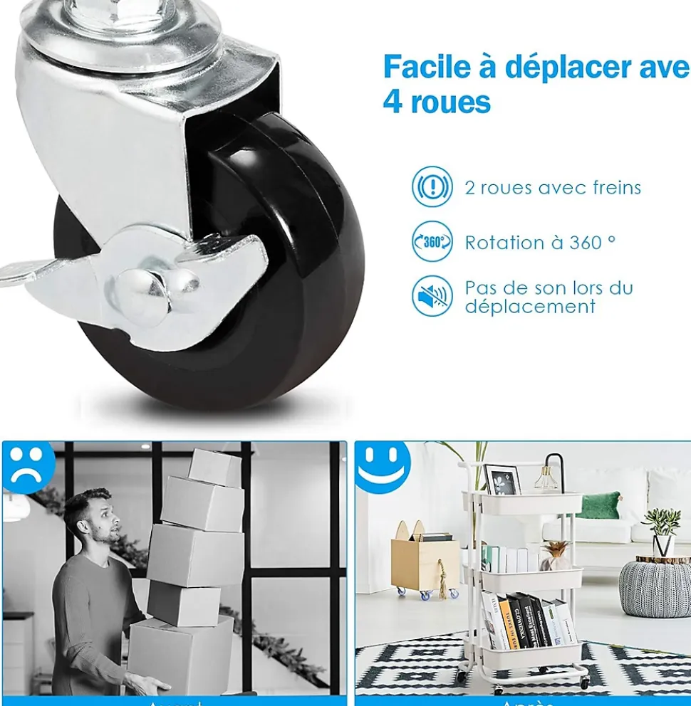 - Polyvalent : Notre chariot de rangement a une forme simple et contemporain qui lui porte une grande variété d’occasion. L’utiliser pour mettre des légumes et des fruits dans la cuisine ou ranger des livres dans le salon. La petite taille vous permet de le mettre dans un petit côté avec peu de place.