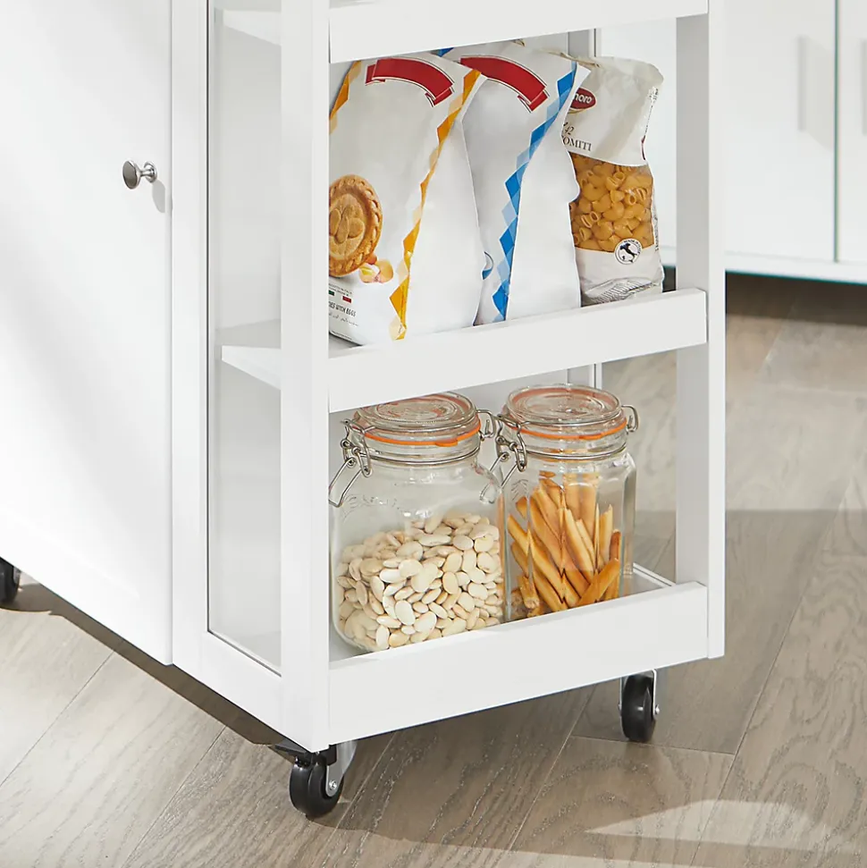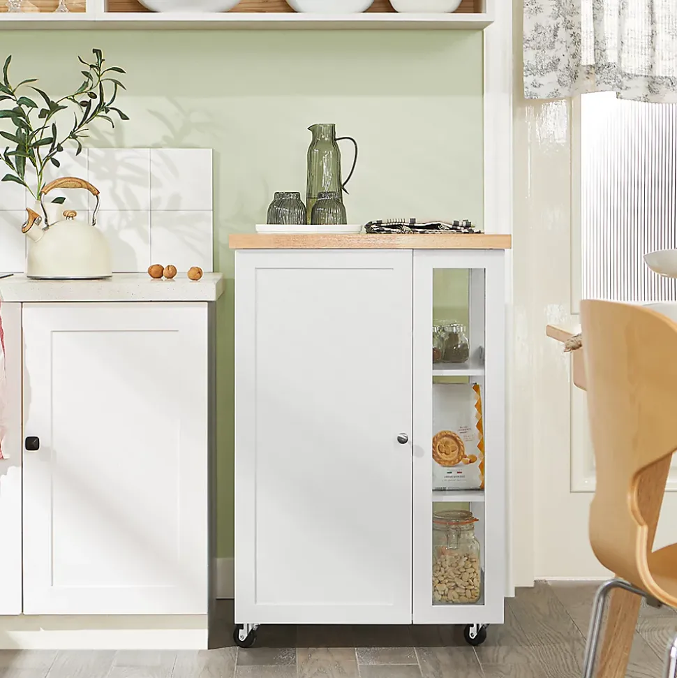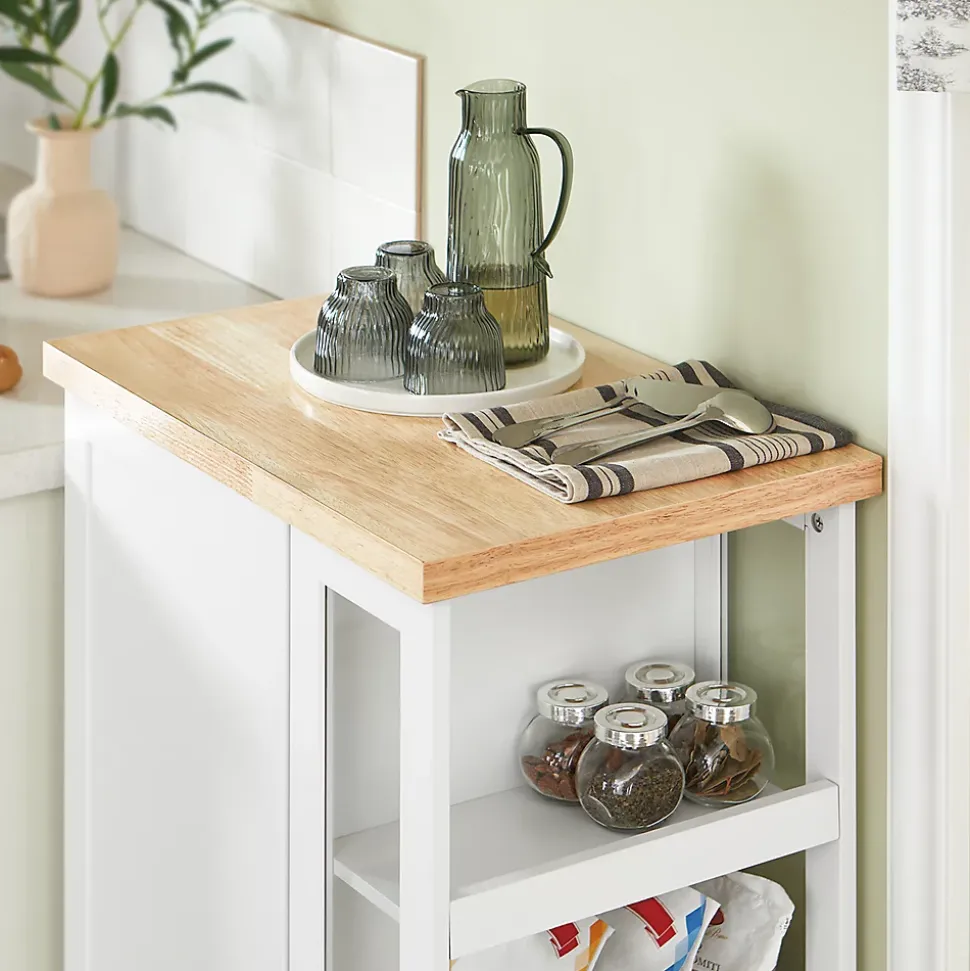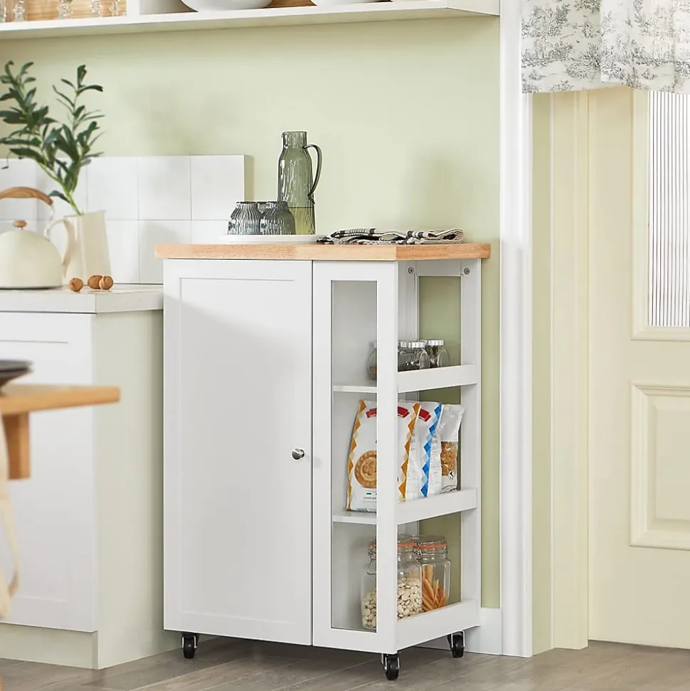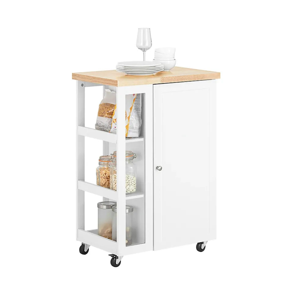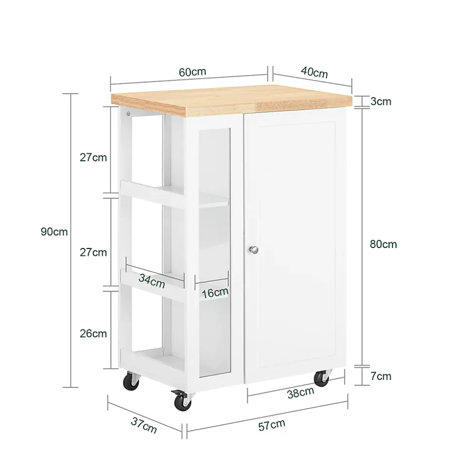 Material: MDF und Glass; Gewicht: ca. 27,5kg, Belastbarkeit: bis 50 kg Produktmaße: BHT ca.: 60x90x40cm (siehe Abbildung); Paketmaße: 88x19x47cm Es verfügt über einen Schrank mit Tür, um Ihre verschiedene Speicherplatzbedarf mit ausreichend Platz zu erfüllen; Die 2 Zwischenböden sind frei justierbar. Dank der 3 offenen Ablagen können Sie Getränke, Tassen und alles, was schnell zur Hand sein soll, abstellen. Neu: Die 3 Ablagefächer können rechts oder links montiert werden. Der Küchenwagen hat vier stabile Gummirollen (2 davon feststellbar), auf denen sich der Küchenwagen leicht auf jeder Oberfläche verschieben lässt. Der Küchenwagen ist immer dort zu Stelle, wo gerade zusätzlicher Platz benötigt wird. Gerade für kleine Küchen ist der Küchenwagen ideal geeignet, um die Arbeitsfläche zu vergrößern und gleichzeitig mehr Stauraum zu generieren. Ausgestattet ist dieser praktische Küchenwagen mit einem geschlossenen Schrank und einem offenen Seitenregal, indem Sie viele Utensilien verstauen können. Die 2 Regalböden des Schranks sind höhenverstellbar. Dank der 4 hochwertigen Räder (zwei mit Stopper) können Sie den Küchenwagen an einem Ort abstellen oder Sie ihn mühelos durch die Wohnung rollen. Dieser Rollwagen erzeugt eine unverwechselbare und moderne Atmosphäre. Durch das schlichte Design macht der Rollwagen überall eine gute Figur und passt zu allen Dekorationsstile.