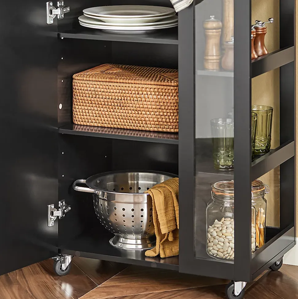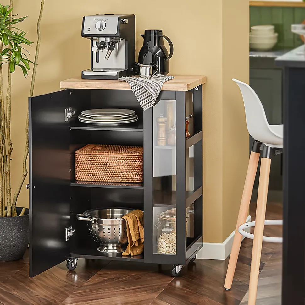 Gewicht: ca. 25kg, Belastbarkeit: bis 75 kg; Material: MDF(E1), Glas; Produktmaße: BHT ca.: 60x90x40cm (Siehe Abbildung); Paketmaße: 90x47x21cm. Es verfügt über einen Schrank mit Tür, um Ihre verschiedene Speicherplatzbedarf mit ausreichend Platz zu erfüllen; Die 2 Zwischenböden sind frei justierbar. Neu: Die 3 Ablagefächer können rechts oder links montiert werden. Dank der 3 offenen Ablagen rechts können Sie Getränke, Tassen und alles, was schnell zur Hand sein soll, abstellen. Der Küchenwagen hat vier stabile Gummirollen (2 davon feststellbar), auf denen sich der Küchenwagen leicht auf jeder Oberfläche verschieben lässt. Produktdetails: – Farbe: Schwarz – Material: MDF(E1) – Produktmaße: BHT ca.: 60x90x40cm – Paketmaße: 90x47x21cm – Gewicht: ca.: 25kg – Belastbarkeit: bis 75kg Lieferumfang: – 1 x Küchenwagen – 1 x Zubehörbeutel – 1 x Anleitung