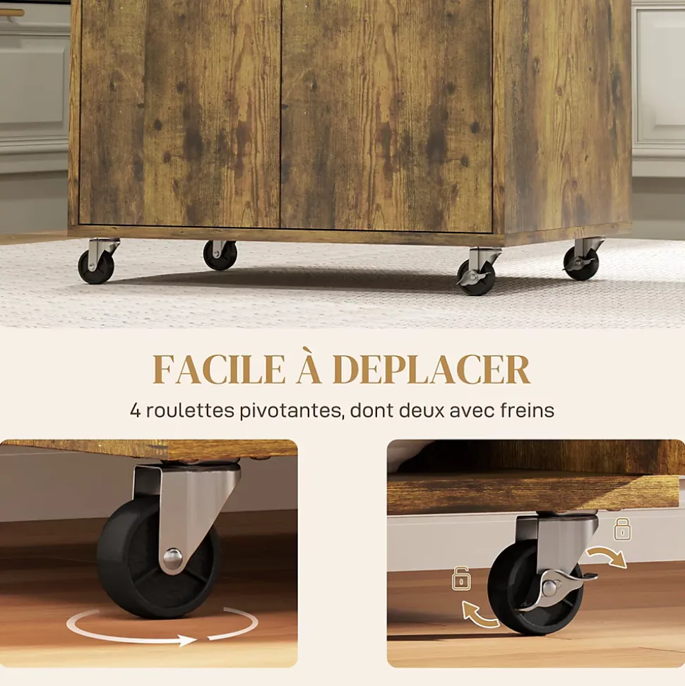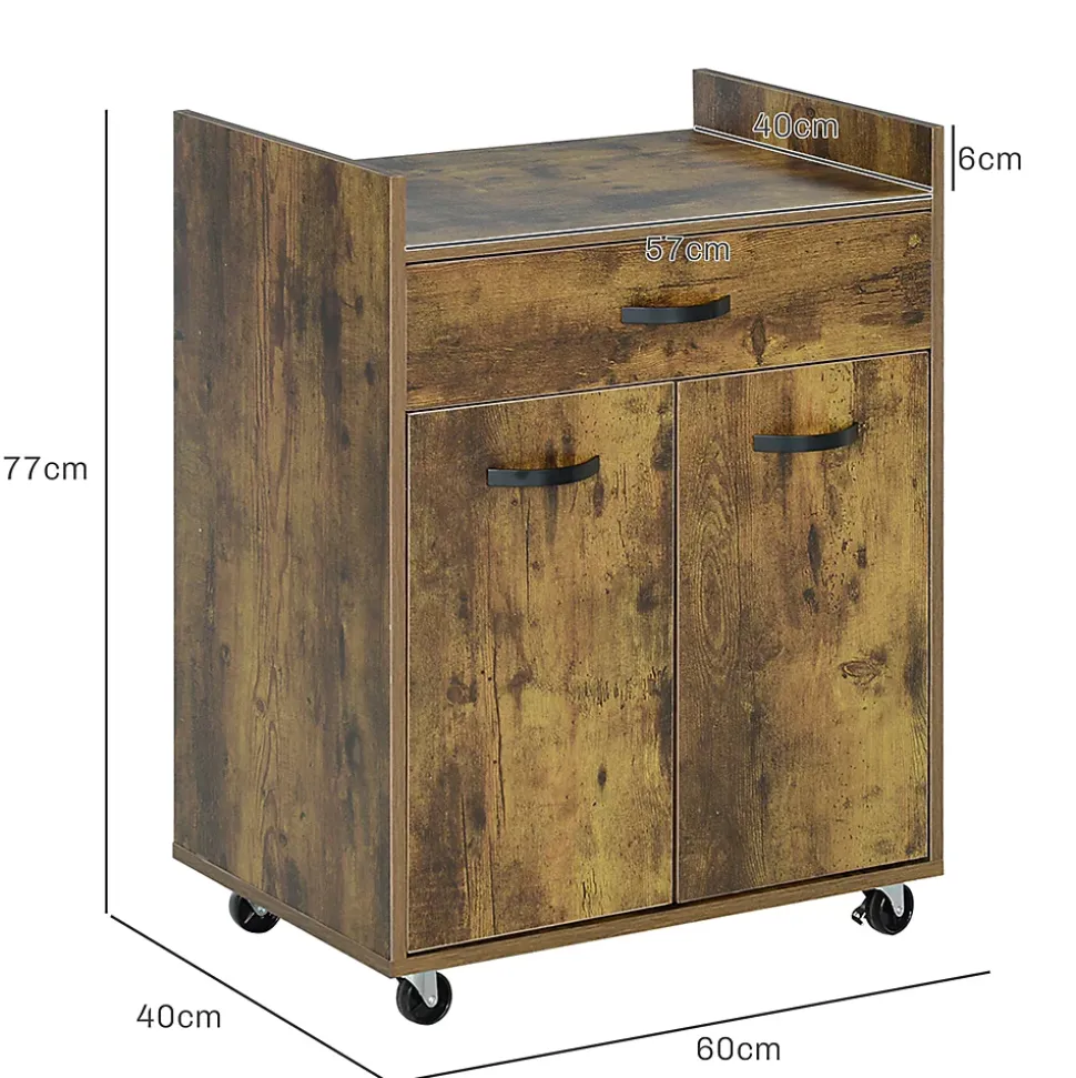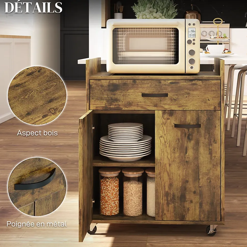 Ce chariot de service de HOMCOM est une option idéale pour garder votre cuisine propre et rangée. Un tiroir et un placard fermé offrent grand espace pour les fournitures et les accessoires. Le dessus de table est assez grand pour mettre un four à micro-ondes. Les roues avec 2 freins facilitent le déplacement. Son style moderne convient à la plupart des meubles de maison.Caractéristiques :- Un tiroir pratique, un placard à double porte et un plateau de table offrent beaucoup de rangement- Tablette réglable intégrée à 3 niveaux pour répondre à vos besoins- 4 roues à roulement doux dont 2 avec freins pour une libre circulation- La taille compacte est flexible pour se déplacer d’une pièce à l’autre- Le bureau avec déflecteur empêche les objets de tomber- Équipé de panneaux de particules pour un nettoyage facile et peu d’entretien- Comprend une conception anti-basculement pour plus de sécurité- Assemblage requisSpécifications :- 3 coloris au choix : blanc, aspect chêne clair ; aspect bois vieilli ; noir, aspect chêne clair- Matériau : panneau de particules- Dim. totales : 60l x 40P x 77H cm- Dim. table : 57l x 40P x 6H cm- Dim. intérieures du tiroir : 51,5l x 28,5P x 8H cm- Dim. porte : 28L x 47,5H cm- Dim. intérieures du placard (étagère au milieu) : 56,5l x 36P x 22H cm (haut), 56,5l x 36P x 23,5H cm (bas)- Charge max. recommandée : 40 kg (au total), 3 kg (tiroir), 5 kg (étagère)- Réf. : 801-209/209V80RB/209V80BK