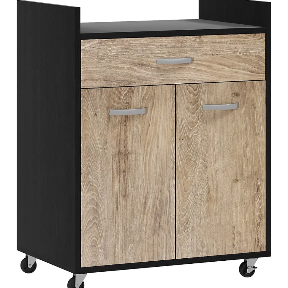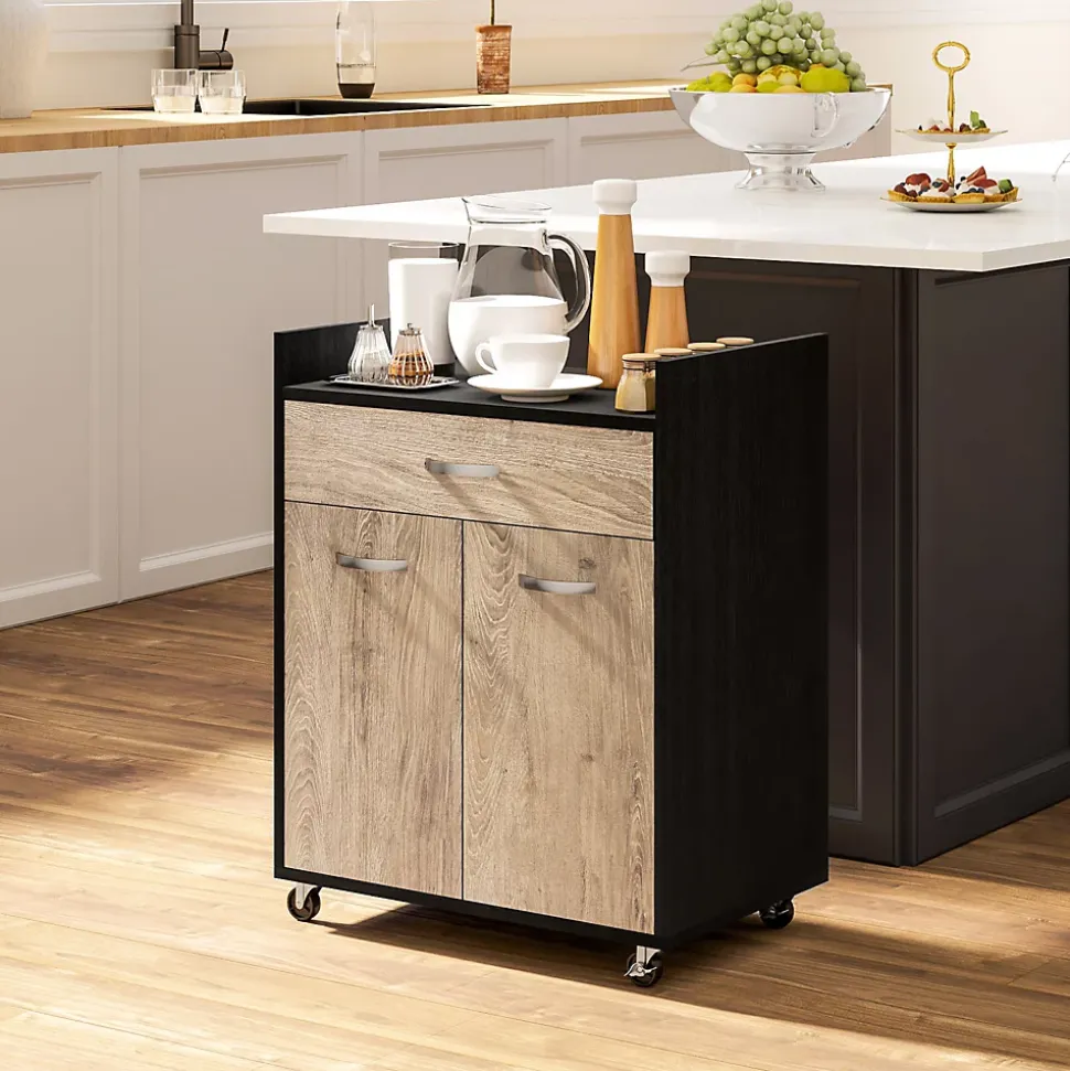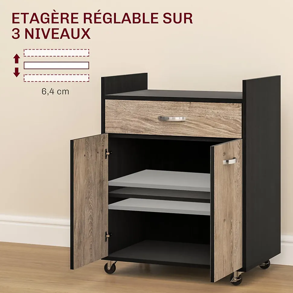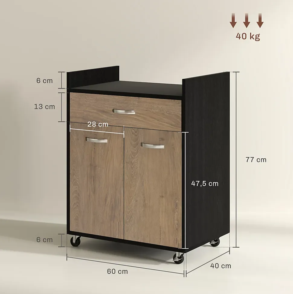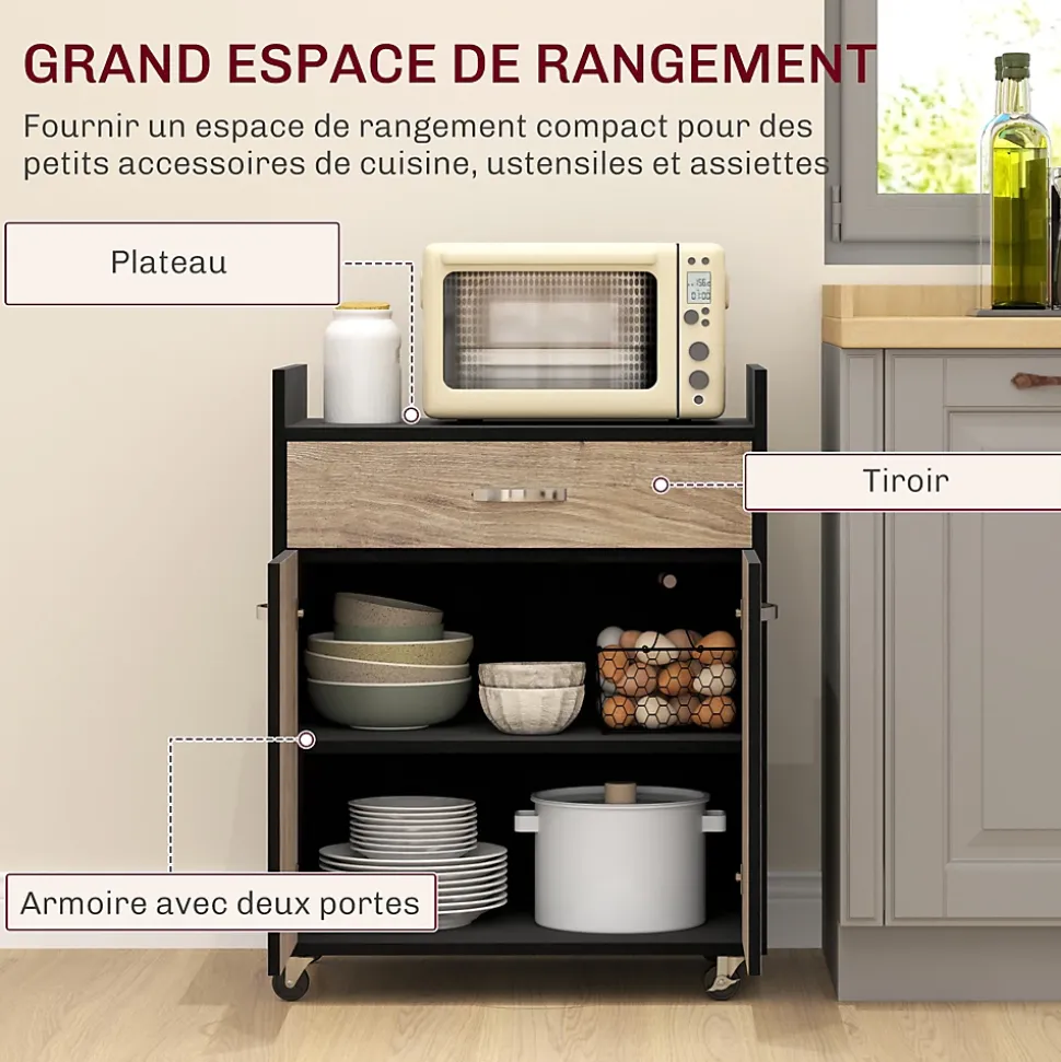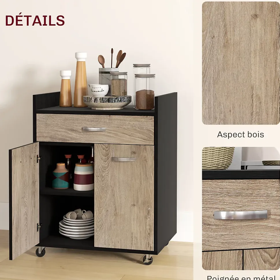 Ce chariot de service de HOMCOM est une option idéale pour garder votre cuisine propre et rangée. Un tiroir et un placard fermé offrent grand espace pour les fournitures et les accessoires. Le dessus de table est assez grand pour mettre un four à micro-ondes. Les roues avec 2 freins facilitent le déplacement. Son style moderne convient à la plupart des meubles de maison.Caractéristiques :- Un tiroir pratique, un placard à double porte et un plateau de table offrent beaucoup de rangement- Tablette réglable intégrée à 3 niveaux pour répondre à vos besoins- 4 roues à roulement doux dont 2 avec freins pour une libre circulation- La taille compacte est flexible pour se déplacer d’une pièce à l’autre- Le bureau avec déflecteur empêche les objets de tomber- Équipé de panneaux de particules pour un nettoyage facile et peu d’entretien- Comprend une conception anti-basculement pour plus de sécurité- Assemblage requisSpécifications :- 3 coloris au choix : blanc, aspect chêne clair ; aspect bois vieilli ; noir, aspect chêne clair- Matériau : panneau de particules- Dim. totales : 60l x 40P x 77H cm- Dim. table : 57l x 40P x 6H cm- Dim. intérieures du tiroir : 51,5l x 28,5P x 8H cm- Dim. porte : 28L x 47,5H cm- Dim. intérieures du placard (étagère au milieu) : 56,5l x 36P x 22H cm (haut), 56,5l x 36P x 23,5H cm (bas)- Charge max. recommandée : 40 kg (au total), 3 kg (tiroir), 5 kg (étagère)- Réf. : 801-209/209V80RB/209V80BK