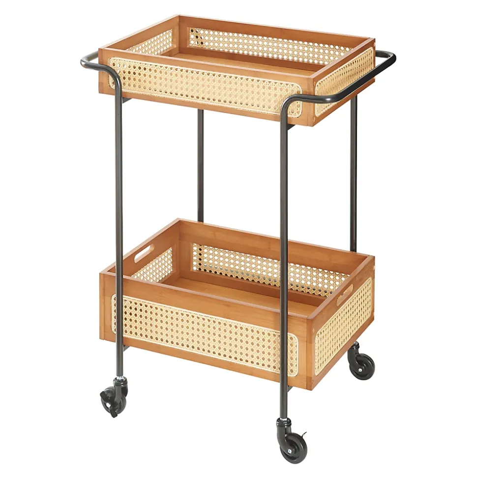 Chariot de serviceCe chariot de service pratique est le complément parfait pour votre maison ou lieu de travail. Doté de 4 roulettes maniables, il se déplace facilement, offrant ainsi une grande flexibilité d’utilisation dans divers espaces.Ses 2 corbeilles de rangement décoratives fournissent un espace généreux pour la vaisselle, les boisson et les snacks.Polyvalent, il ne se limite pas à la cuisine : il trouve également sa place dans la salle de bain, où il offre un rangement pratique pour les produits de soin et accessoires. Au bureau, il devient un allié utile pour transporter fournitures ou dossiers.Avec son design intemporel, ce chariot s’intègre harmonieusement dans tout type d’intérieur, apportant une touche d’élégance à votre espace.Points forts :- desserte élégante pour la maison ou le bureau- 2 paniers décoratifs- freins d’arrêt pour une bonne stabilité- pratique pour servir les aliments et les boissons- organise les ustensiles et les fournitures de bureau- s’intègre dans différents styles d’aménagement- montage rapide et facileMatière :- cadre : métal- bordure du panier : bambou avec tressage plastique- tablette : MDFDimensions :- totales (ha x la x pro) : 80,5 x 61 x 39 cm- plateau de rangement (l x p) : 48 x 33 cm chacun- hauteur de la corbeille supérieure : 10 cm- hauteur du panier inférieur : 15 cm- distance du sol au panier inférieur : 15 cmCouleur :- cadre : noir- paniers : effet bois + aspect rotinContenu de la livraison :1 x desserteProduit de la marque :[en.casa]