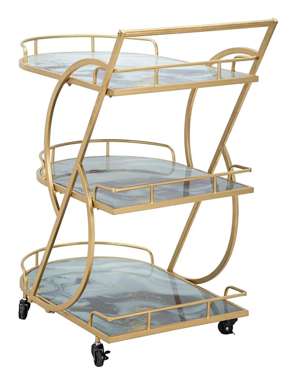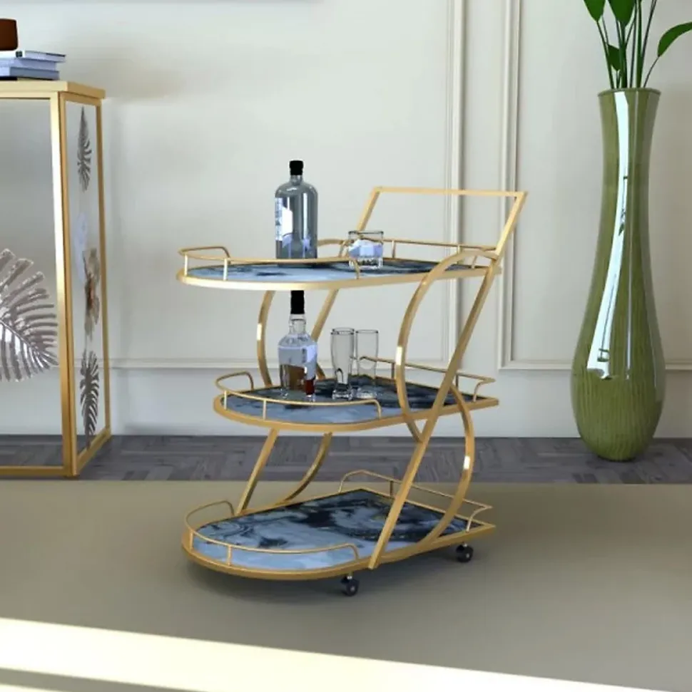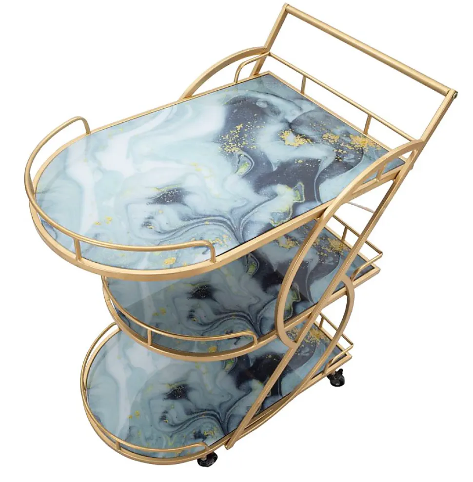 Chariot de restauration avec structure en métal doré avec 3 étagères en verre réalisées avec un travail imitant le marbre. Le dessin géométrique composé de 2 demi-cercles et le contraste des couleurs donnent une touche d’élégance