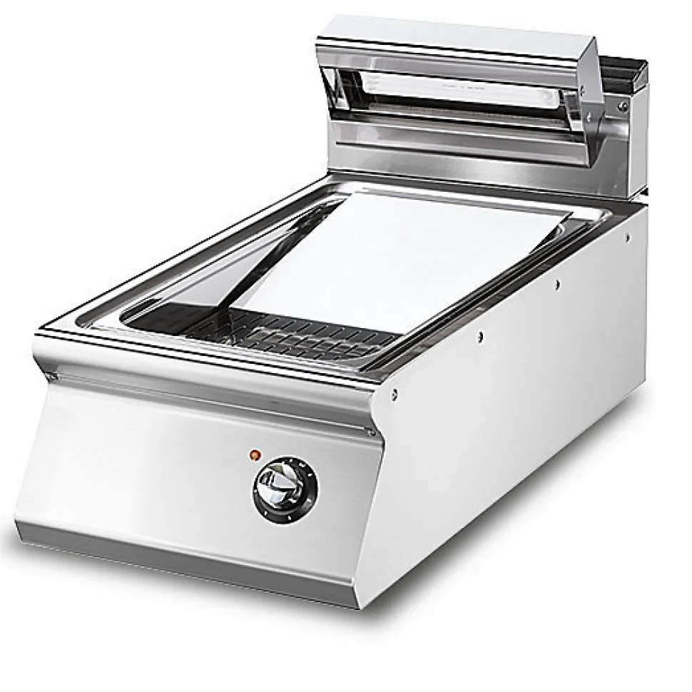 Chauffe-frites électrique – Virtus Chauffe-frites électrique de la marque Virtus, fabriqué en acier inoxydable de haute qualité.Panneaux latéraux, fond et dos en acier inoxydable. Plateau en acier inoxydable AISI 304 15/10. Conduit en fonte émaillée. Conteneur amovible GN 1/1 et faux fond en acier inoxydable.Chauffage par élément céramique infrarouge.Interrupteur marche/arrêt et voyant lumineux indiquant la mise sous tension. Boutons spécialement conçus pour éviter la pénétration d’eau dans le panneau de commande.Taille (mm): L400 P730 H250Poids (Kg): 16.30Puissance: électricitéPuissance (Kw): 1,000Volt: 230Fréquence: 50/60Phase: 1F+NCapacité: GN 1/1