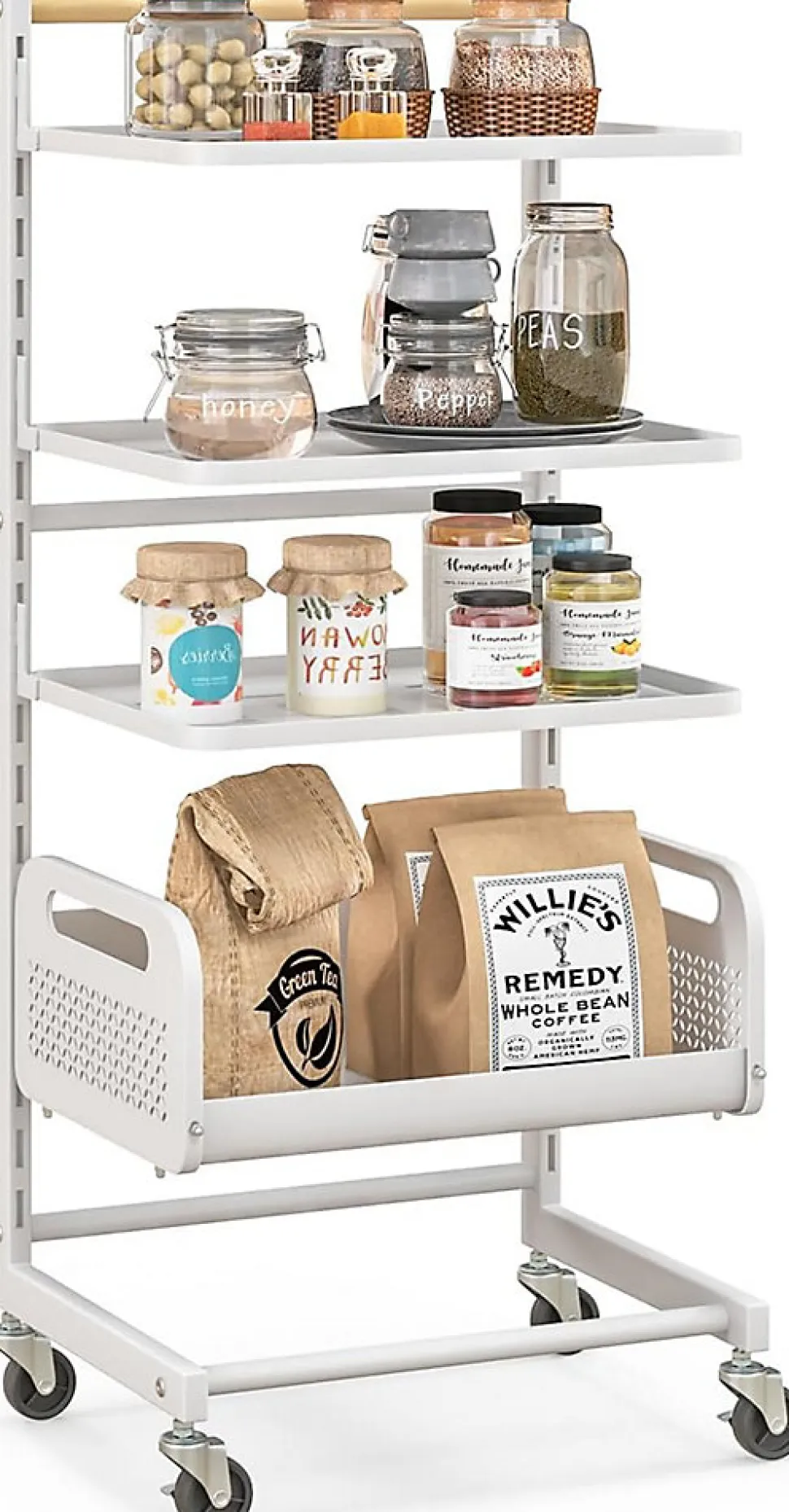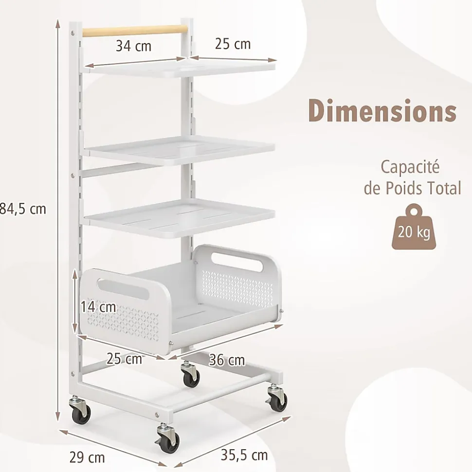 Notre chariot roulant à 4 niveaux est conçu pour améliorer la fonctionnalité de n’importe quel espace. Polyvalent, il dispose de 4 niveaux de rangement, dont 3 étagères supérieures robustes et un panier inférieur en maille métallique, offrant un rangement spacieux. Avec 20 positions de fentes, il permet des ajustements par incréments de 3,5 cm, adaptées pour accueillir des articles de différentes tailles. Doté de roulettes verrouillables et d’une poignée en bois d’hévéa, il vous permet de le déplacer facilement dans la salle à manger, le salon ou la cuisine.