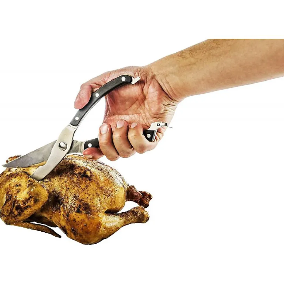 Ciseaux à viande Royalty LinePréparez facilement votre prochain repas avec les ciseaux à viande robustes Royalty Line . La construction robuste et les poignées à ressort rendent ces ciseaux faciles à manipuler lorsque vous coupez tout, de la viande aux os.Ciseaux à viande multifonctionnels qui coupent facilement la viande, les coquilles ou les osConstruction robuste en acier inoxydable pour plus de durabilitéPoignée entièrement rivetée pour une plus grande stabilitéLes poignées à ressort rendent les cisailles faciles à utiliserMécanisme de verrouillage pour un stockage en toute sécuritéConstruction robuste en acier inoxydableLes cisailles à viande polyvalentes d’Oklahoma Joe sont dotées d’une construction en acier inoxydable durable pour couper facilement la viande, la coquille ou les os.Stabilité accrue et convivialitéPossède une poignée complète rivetée pour une plus grande stabilité et est à ressort, ce qui rend les ciseaux faciles à utiliser. (Le manche entièrement continu signifie que la lame s’étend dans le manche).Loquets pour un stockage et une manipulation en toute sécuritéLorsque vous n’utilisez pas les ciseaux, l’extrémité du manche est dotée d’un mécanisme de verrouillage pour un rangement et une manipulation en toute sécurité.PAS SEULEMENT POUR LE POULETCes ciseaux de cuisine magnifiquement conçus sont probablement l’accessoire le plus polyvalent que vous aurez dans votre cuisine. Vous serez surpris de la fréquence à laquelle vous les utiliserez et pas seulement pour découper un poulet entier. Comme un couteau suisse : plus vous les utilisez, plus vous découvrez à quel point ils sont polyvalents.QUELQUES FAÇONS D’UTILISER VOS CISEAUX DE CUISINE AUXQUELLES VOUS N’AVEZ PAS ENCORE PENSÉLes ciseaux coupent la pizza en une fraction du temps nécessaire à votre roulette à pizza.Coupez vos herbes directement dans votre plat.