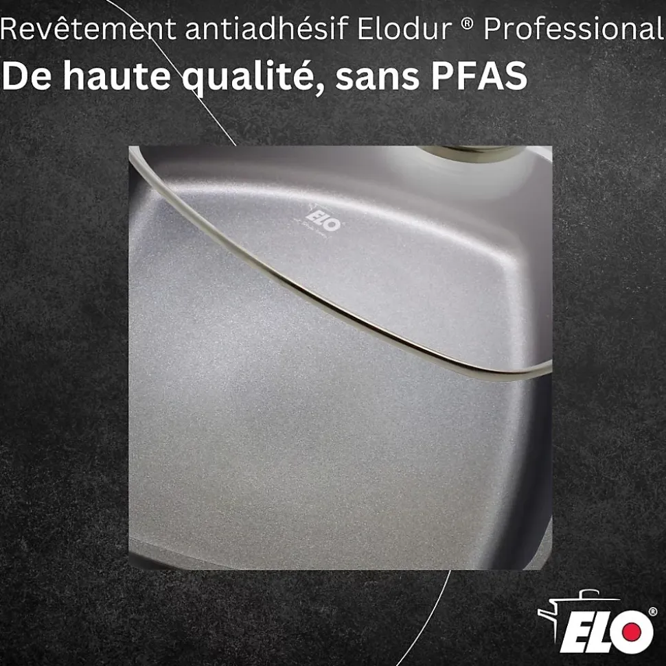 - COMPOSITION: Fonte d’aluminium moulée noire, avec poignées intégrées, revêtement antiadhésif ELODUR Select ; couvercle en verre, cerclé d’acier inoxydable protégeant des chocs