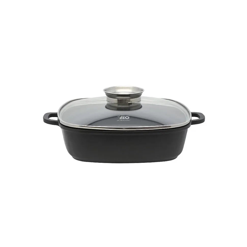 - DESCRIPTION: Cocotte Elo Alucast carrée 28 cm ; 3,6 litres pour 5 personnes, en fonte d’aluminium moulée légère, avec revêtement antiadhésif ELODUR Select