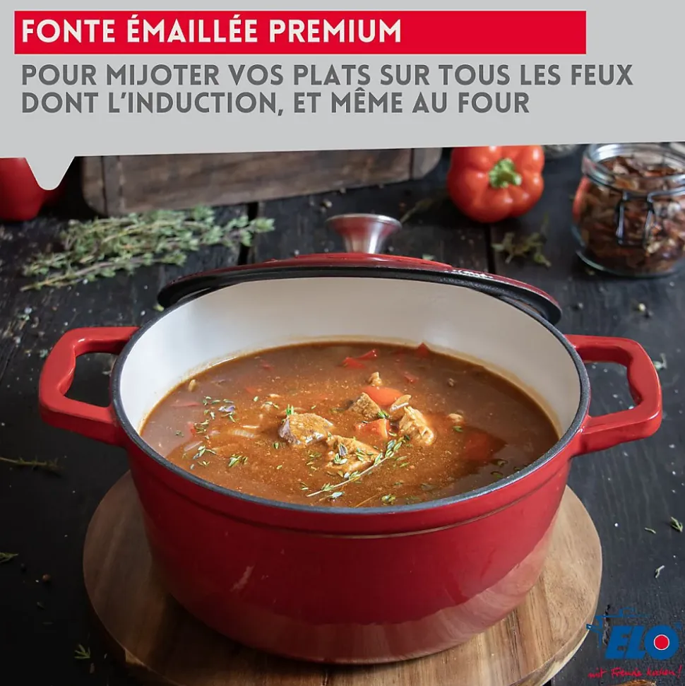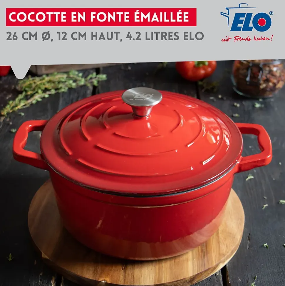 - DESCRIPTION : La cocotte en fonte émaillée rouge cerise de 26 cm et 4,5 L d’Elo est idéale pour la cuisson de ragoûts, de plats mijotés, de rôtis et même de pains ; elle allie qualité de l’artisanat traditionnel et fonctionnalité moderne