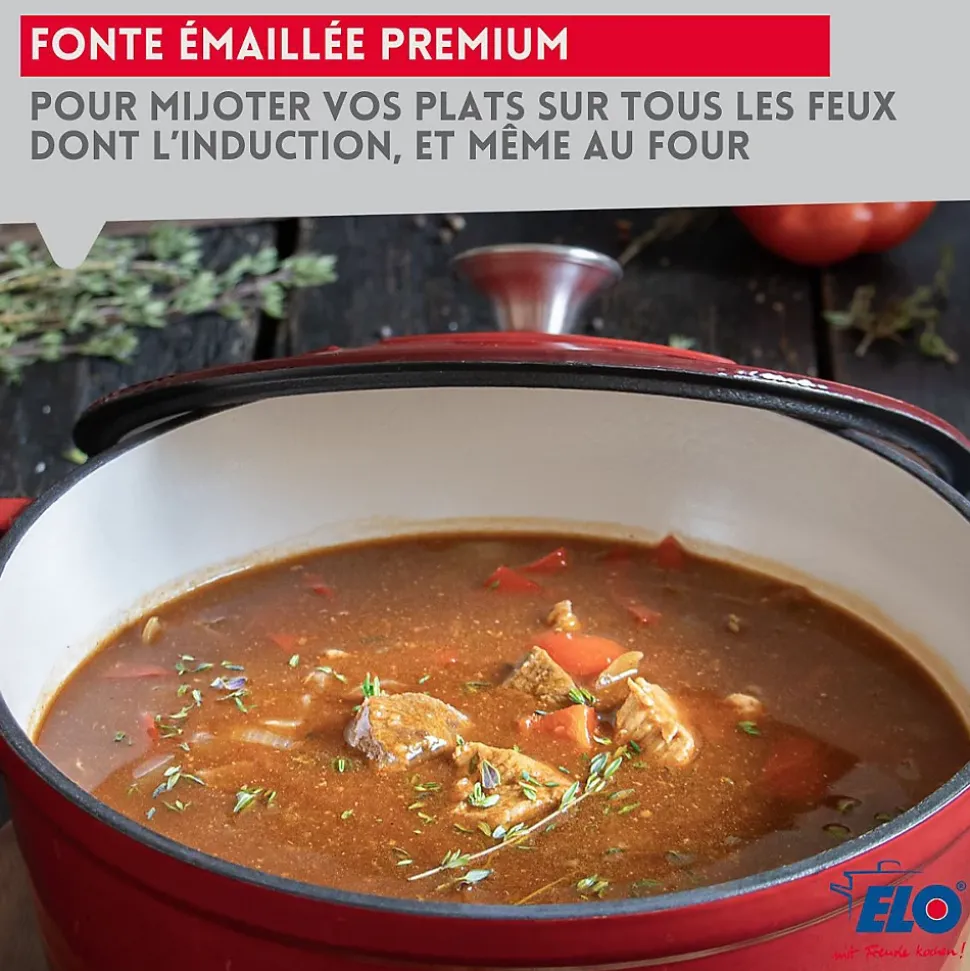 - DESCRIPTION : La cocotte en fonte émaillée rouge cerise de 28 cm et 3 L d’Elo est idéale pour la cuisson de ragoûts, de plats mijotés, de rôtis et même de pains ; elle allie qualité de l’artisanat traditionnel et fonctionnalité moderne