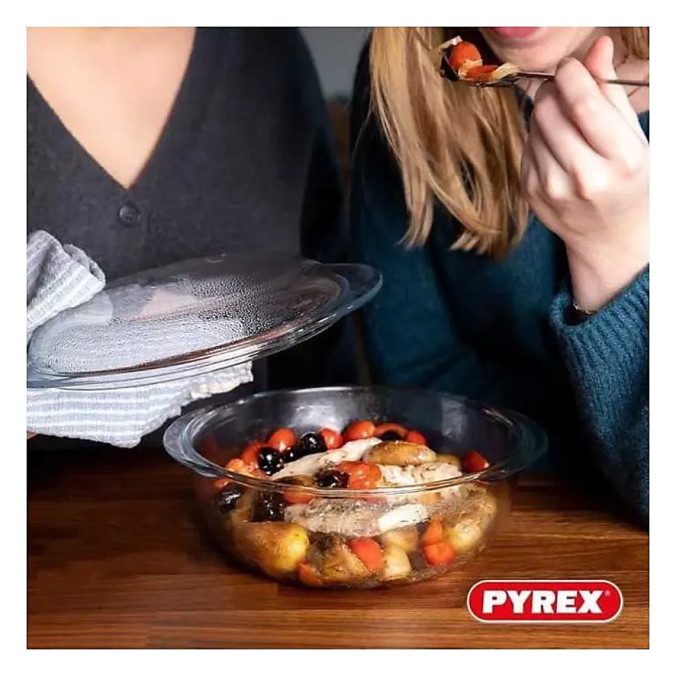 Cocotte ronde Pyrex en verre borosilicate 1,6 L, résistante aux chocs thermiques (-40° à +300°), fabriquée en France, livrée avec couvercle et garantie 10 ans, idéale pour la cuisson et la rôtisserie au four.
