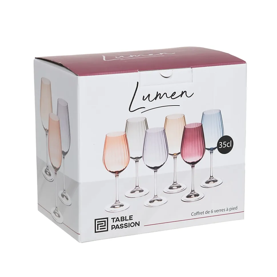 Apportez une touche de couleur et d’élégance à votre table avec ce coffret de 6 verres à pied Lumen 35 cl de Table Passion. Chaque verre, décliné en différentes teintes raffinées, sublimera vos moments de dégustation tout en apportant une ambiance chaleureuse à vos repas. Pour préserver l’éclat unique et la qualité de ces verres, nous recommandons un lavage à la main. Un choix parfait pour allier style et convivialité.Diamètre du verre : 6 cmHauteur du verre : 22,6 cmPoids du verre : 189 gCollection : Lumen Matière : Verre cristallin Couleur : Multicolore Longueur : 26.00 cm Largeur : 18.00 cm Hauteur : 23.00 cm Diamètre : 6.00 cmCapacité : 35.00 cl Compatible Lave-vaisselle