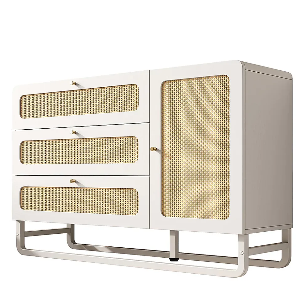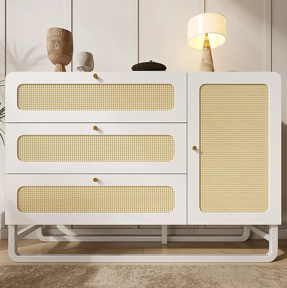 - 【Style cottage naturel et design incurvé】Cette commode est fabriquée à partir de panneaux de bois de haute qualité avec une finition blanche. Les tiroirs et les portes sont décorés de rotin jaune et de poignées métalliques dorées, ce qui crée une palette de couleurs claires et un style cottage chaleureux. La combinaison parfaite entre décoration et espace de rangement complète le style décoratif de n’importe quelle pièce.