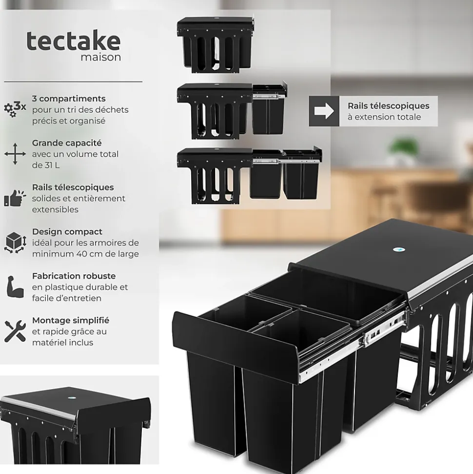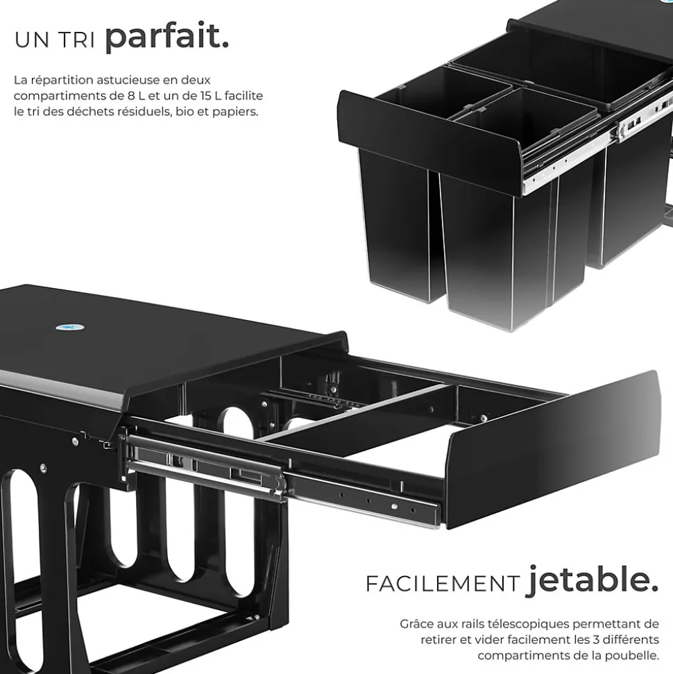 - Points Forts:Système de collecte des déchets spacieux avec des rails télescopiques.3 bacs séparés pour un tri des déchets précis.Pour les placards d’une largeur minimale de 40 cm.Fabrication en plastique robuste et entretien facile.Montage simple.