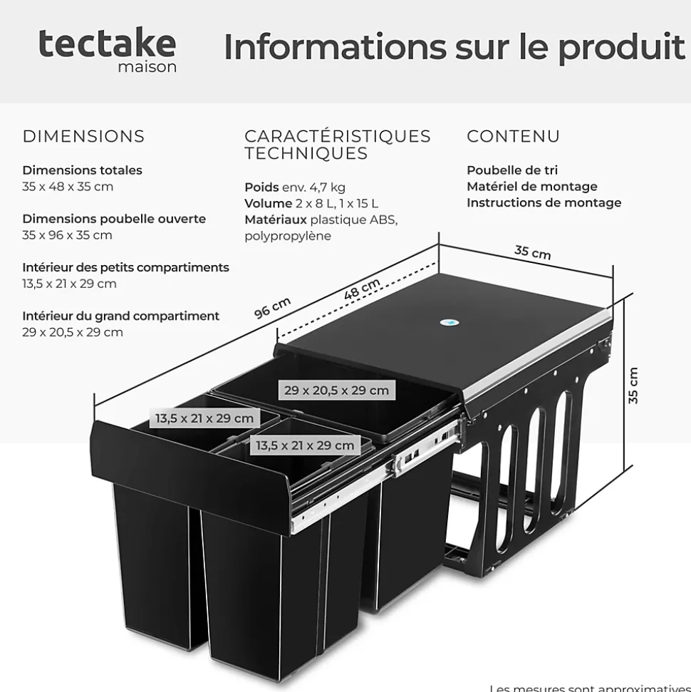 - Contenu de la livraison:Poubelle de triMatériel de montageInstructions de montage