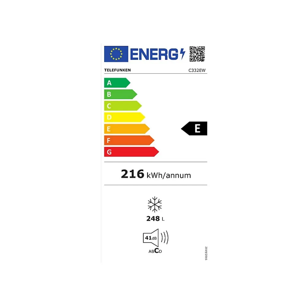 Congélateur armoire 60cm 248l statique Telefunken – Congélateur armoire C332EW de Telefunken. – Type : Congélateur armoire.Type de construction : Pose libre.Volume total (L) : 248.Classe d’efficacité énergétique : E.Emissions de bruit acoustique dans l’air (dB(A)) : 41.Classe d’émission de bruit acoustique dans l’air : C.Conso. d’énergie annuelle (kWh/an) : 216.Classe climatique : SN-T.T°C recommandée pour stockage optimisé des denrées alimentaires dans compartiment 4 étoiles (°C) : -18.Autonomie (h) : 15.Type de froid du congélateur : Statique.Type de dégivrage : Manuel.Pouvoir de congélation spécifique (kg/24h) : 16.Nombre d’étoiles : 4.Connecté : Non.Régulation de le température : Mécanique.Autonomie (h) : 15.Type de gaz réfrigérant : R600a.Fabrique de glaçons : Non.Nbre tiroir(s) et/ou abattant(s) : 5 / 2.Equipement : Bac à glaçons.Régulation de le température : Mécanique.Dispositif de congélation rapide : Non.Couleur : Blanc.Hauteur (cm) : 175.Largeur (cm) : 59.5.Profondeur (cm) : 60.Poids (kg) : 56.5.