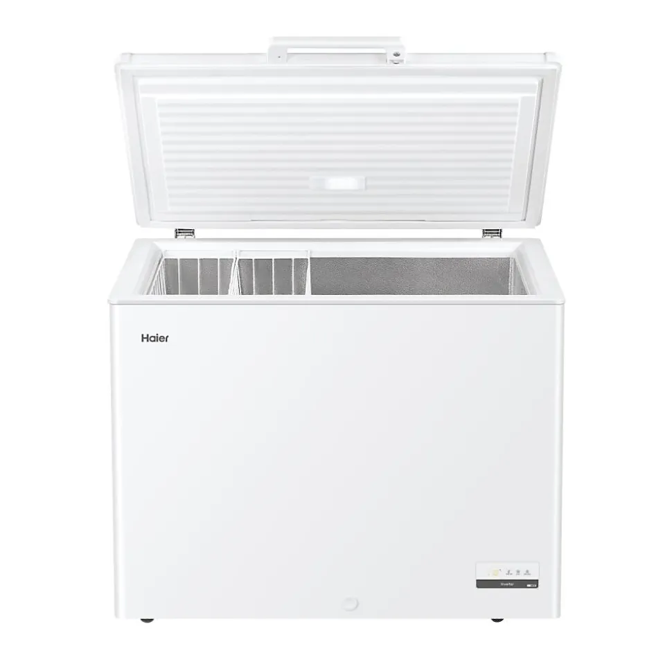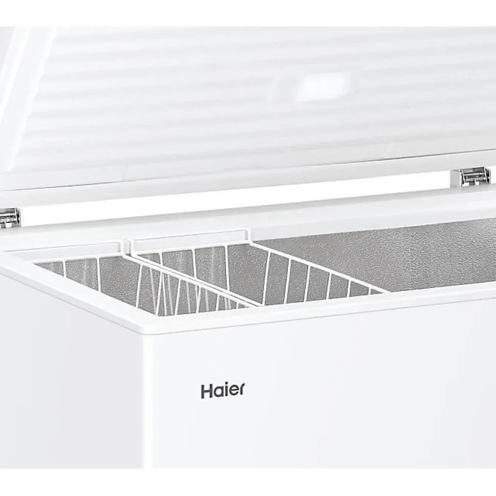 Congélateur coffre 111cm 300l Haier – Congélateur coffre HCE301E de Haier.Display électronique :Grâce au panneau électronique externe intuitif, réglez les différentes fonctions en un seul clic sans même ouvrir la porte de votre congélateur.Super congélation (-30°C) :Cette fonction permet d’accélérer la prise au froid de vos aliments. Grâce à une température allant jusqu’à -30°C, vos denrées seront conservées jusqu’à leurs consommations finales.Serrure :Une serrure robuste et efficace qui scelle l’ouverture de votre congélateur afin de garder vos aliments en toute sécurité.Eclairage LED :Un éclairage lumineux qui facilite la visualisation du contenu de votre congélateur. – Type de produit : Congélateur coffre.Classe climatique : SN-T. Cet appareil est conçu pour être utilisé à une température ambiante comprise entre 10°C et 43°C.Capacité nette totale : 300 litres.Classe énergétique : E.Classe d’efficacité sonore : B.Niveau sonore : 35 dB.Type de froid : Froid Statique.Eclairage LED : Oui.Autonomie : 25 heures.Pouvoir de congélation (kg/24h) : 16.Conso. d’énergie (kWh/an) : 232.Dégivrage : Manuel.Gaz réfrigérant : R 600 a.Nombre de paniers : 2.Matériau des paniers : Métal.Bac à glaçons : Non.Roulettes : 4.Cordon d’alimentation (cm) : 150/155.Display : Externe.Interface de contrôle : Electronique.Connectivité : Non.Type de moteur : Inverter.Type de poignée : Externe.Etendue de la température : -30 à 10°C.Serrure : Oui.Porte réversible : Non.Alarme de température : Visuelle.Fonction super congélation : Oui.Témoin super congélation : Oui.Finition intérieure : Aluminium martelé.Type de froid : Statique.Couleur : Blanc.Hauteur (cm) : 89.5.Largeur (cm) : 111.Profondeur (cm) : 62.Dimensions nettes avec roulettes (cm) : 89.5 x 111 x 62.Profondeur porte